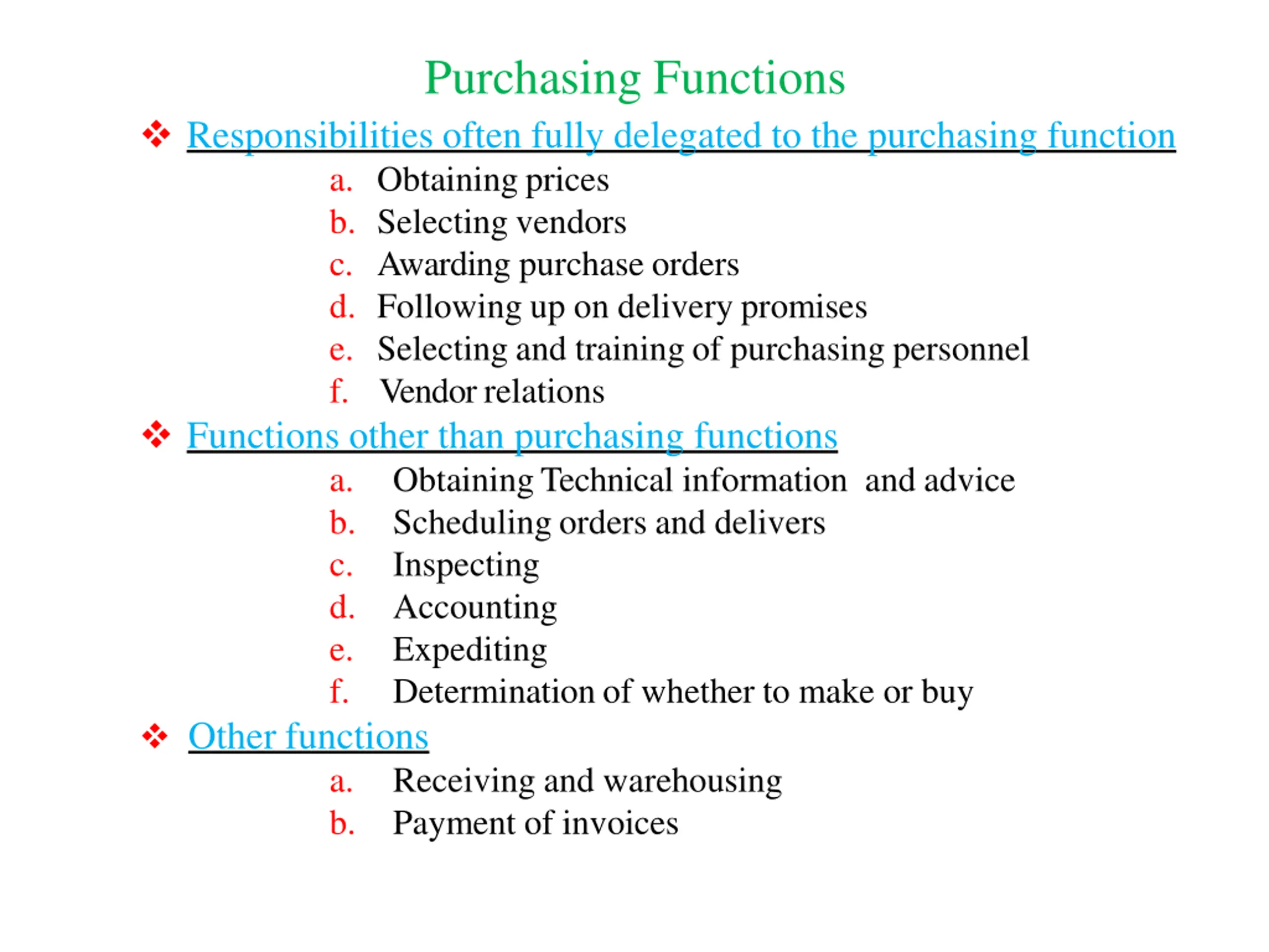 Purchasing Functions Responsibilities often fully delegated to the purchasing function a. Obtainingprices b. Selecting vendors c. Awarding purchase orders d. Following up on delivery promises e. Selecting and training of purchasing personnel f. Vendorrelations Functions other than purchasing functions a. ObtainingTechnical information and advice b. Scheduling orders and delivers c. Inspecting d. Accounting e. Expediting f. Determination of whether to make or buy Other functions a. Receiving and warehousing b. Payment of invoices