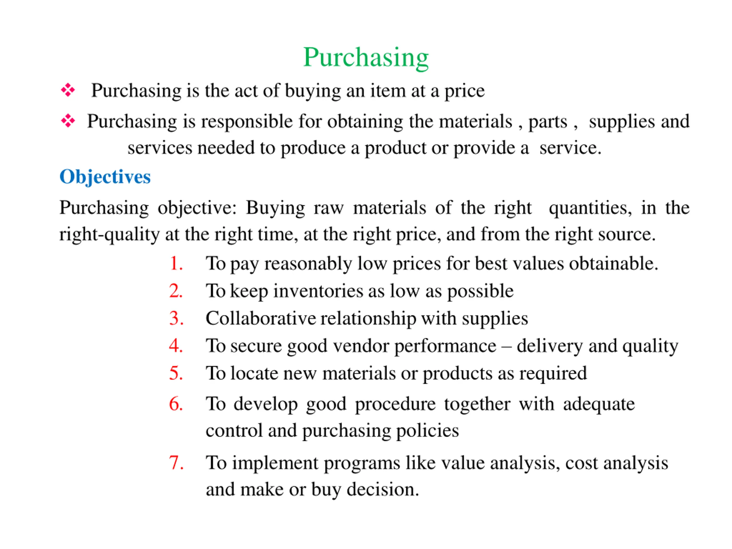Purchasing Purchasing is the act of buying an item at a price Purchasing is responsible for obtaining the materials , parts , supplies and services needed to produce a product or provide a service. Objectives Purchasing objective: Buying raw materials of the right quantities, in the right-quality at the right time, at the right price, and from the right source. 1. To pay reasonably low prices for best values obtainable. 2. Tokeep inventories as low as possible 3. Collaborativerelationship with supplies 4. To secure good vendor performance delivery and quality 5. To locate new materials or products as required 6. To develop good procedure together with adequate control and purchasing policies 7. To implement programs like value analysis, cost analysis and make or buy decision.
