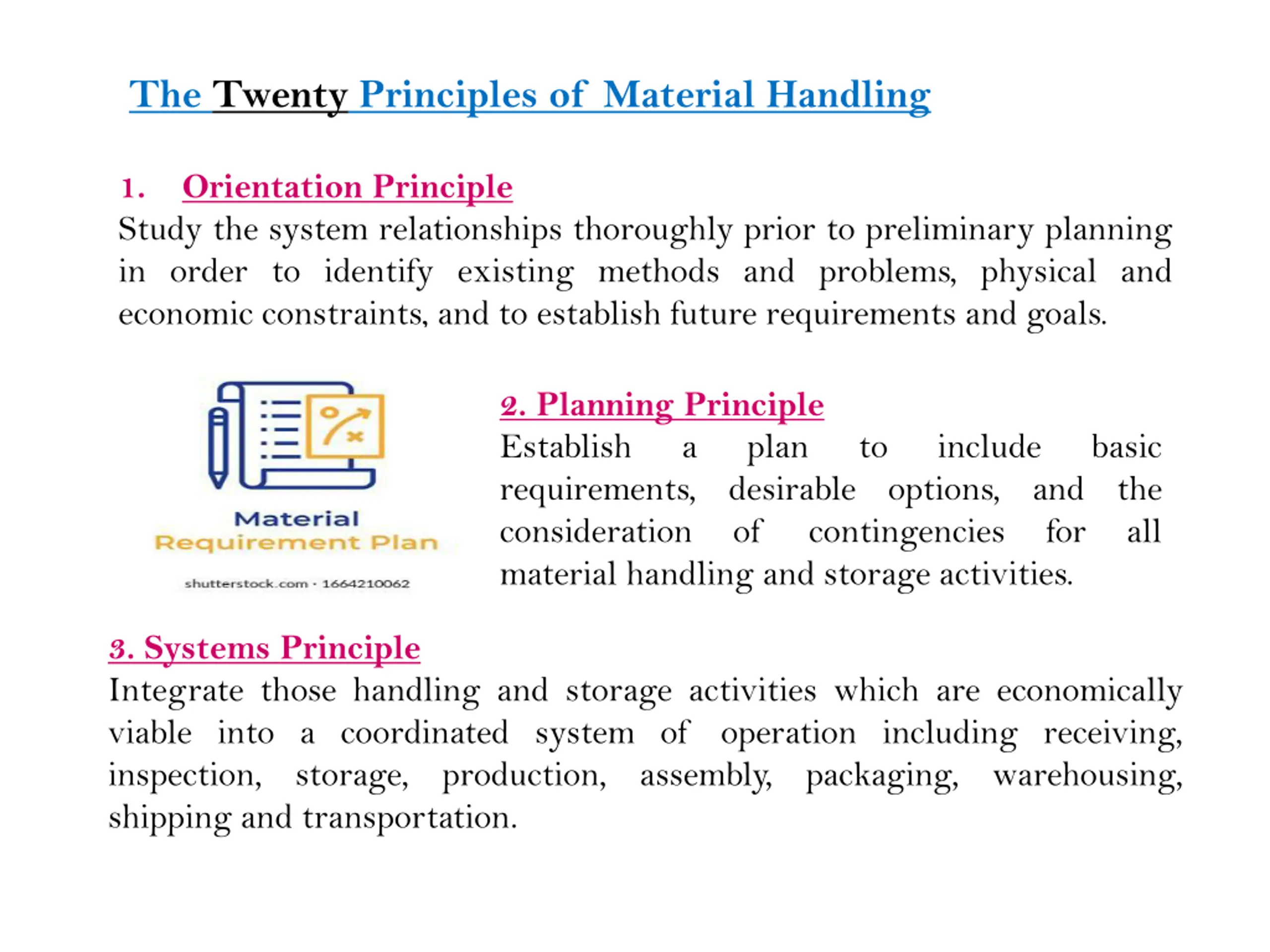 The Twenty Principles of Material Handling 1. Study the system relationships thoroughly prior to preliminary planning in order to identify existing methods and problems, physical and economic constraints, and to establish future requirements and goals. Orientation Principle 2. Planning Principle Establish requirements, desirable options, and the consideration of contingencies for all material handling and storage activities. a plan to include basic 3. Systems Principle Integrate those handling and storage activities which are economically viable into a coordinated system of operation including receiving, inspection, storage, production, assembly, packaging, warehousing, shipping and transportation.