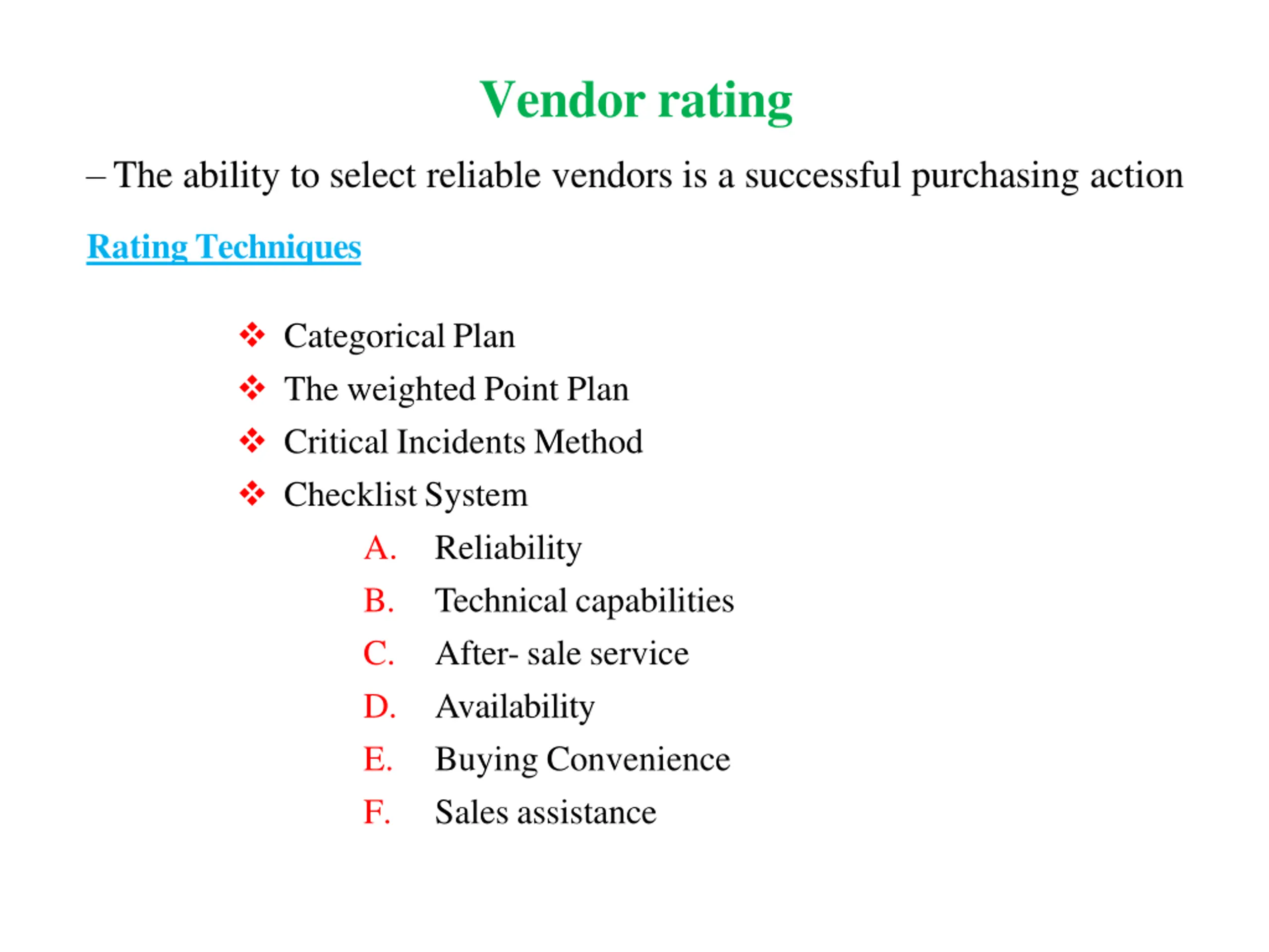 Vendor rating The ability to select reliable vendors is a successful purchasing action Rating Techniques Categorical Plan The weighted Point Plan Critical Incidents Method Checklist System A. Reliability B. Technical capabilities C. After- sale service D. Availability E. Buying Convenience F. Sales assistance