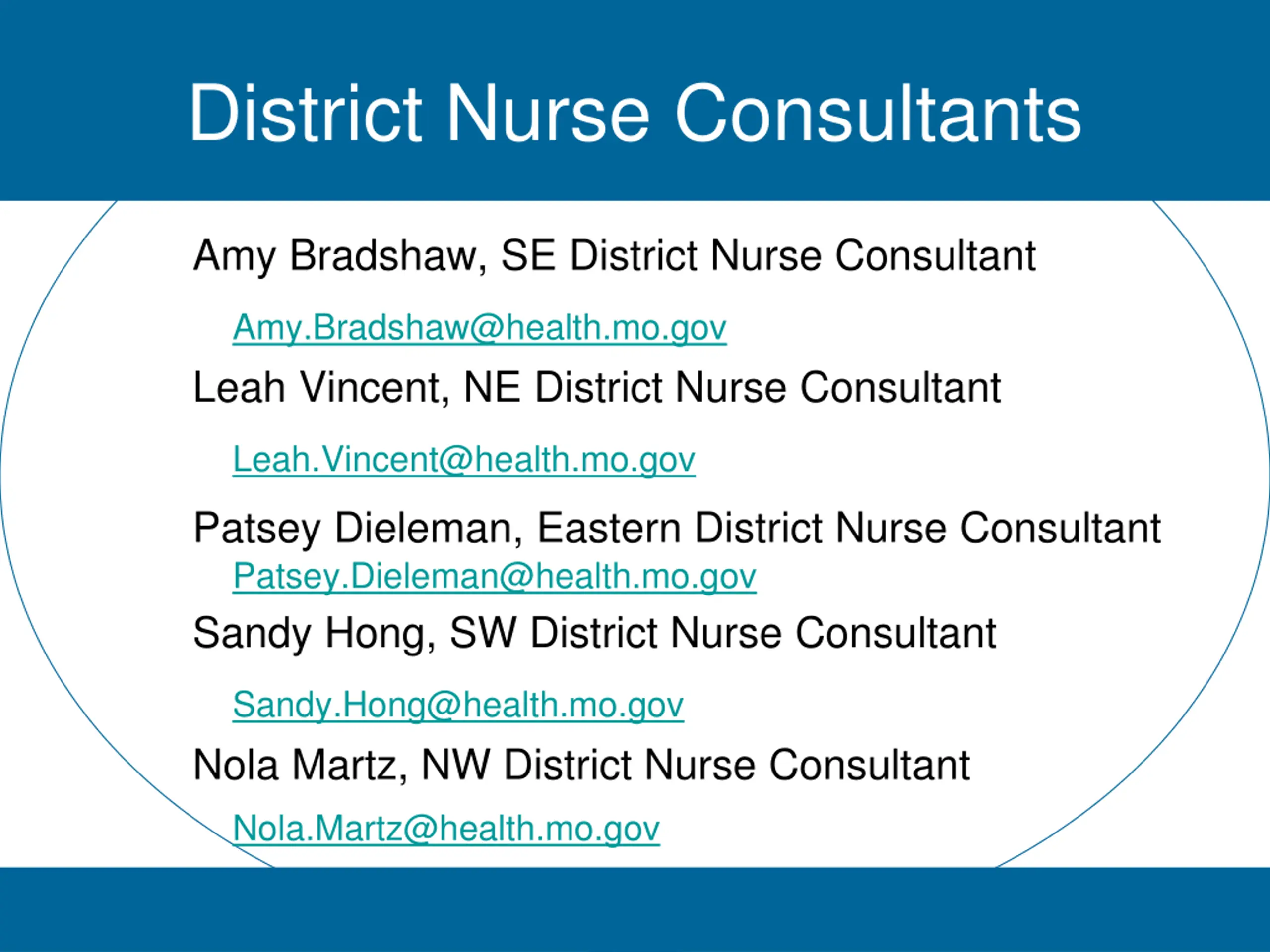 District Nurse Consultants Amy Bradshaw, SE District Nurse Consultant Amy.Bradshaw@health.mo.gov Leah Vincent, NE District Nurse Consultant Leah.Vincent@health.mo.gov Patsey Dieleman, Eastern District Nurse Consultant Patsey.Dieleman@health.mo.gov Sandy Hong, SW District Nurse Consultant Sandy.Hong@health.mo.gov Nola Martz, NW District Nurse Consultant Nola.Martz@health.mo.gov