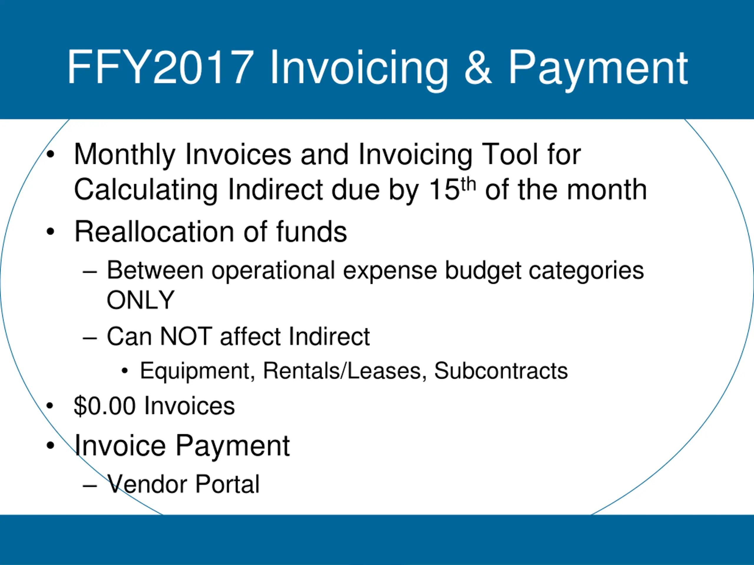 FFY2017 Invoicing & Payment Monthly Invoices and Invoicing Tool for Calculating Indirect due by 15thof the month Reallocation of funds Between operational expense budget categories ONLY Can NOT affect Indirect Equipment, Rentals/Leases, Subcontracts $0.00 Invoices Invoice Payment Vendor Portal
