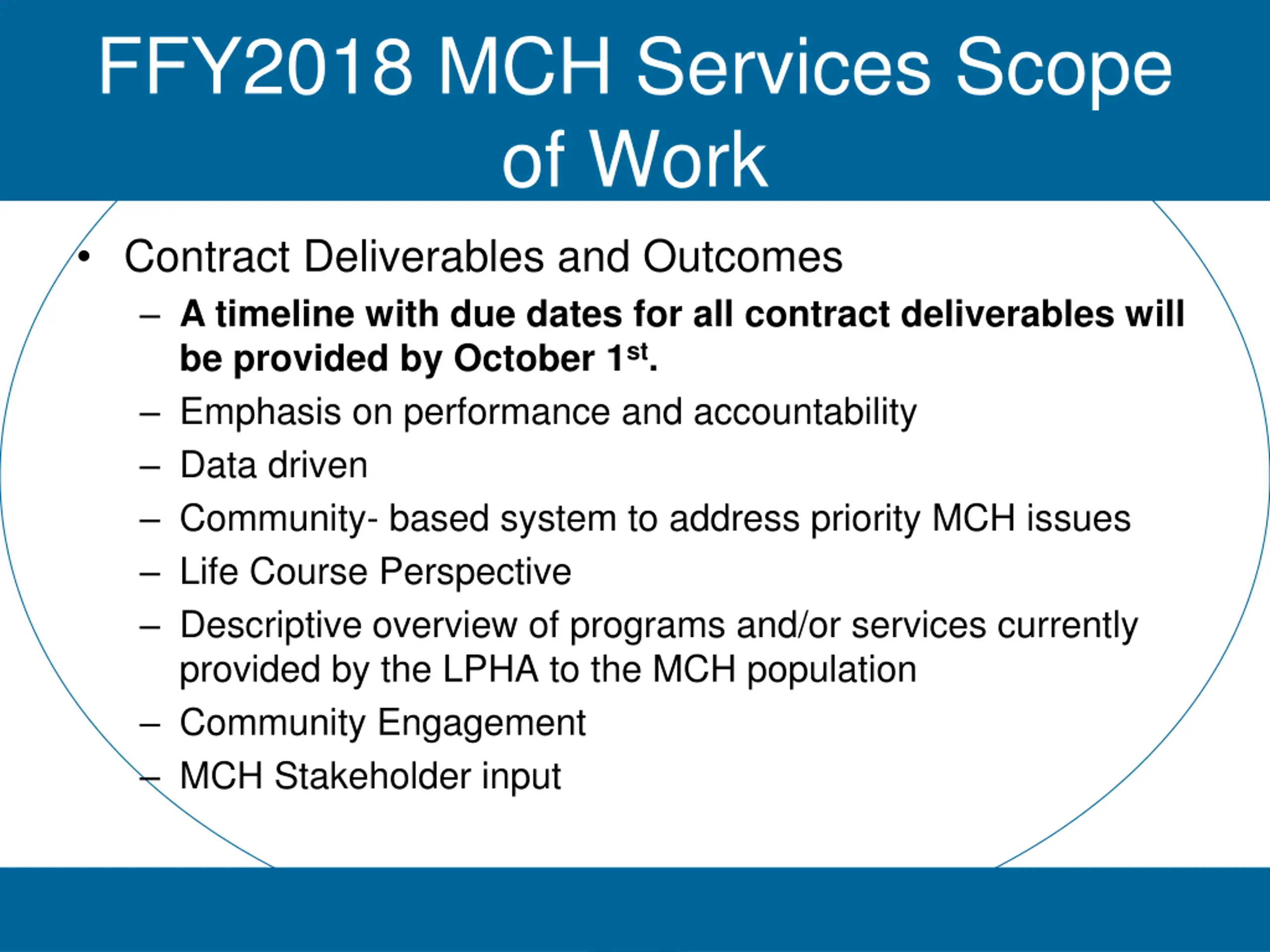 FFY2018 MCH Services Scope of Work Contract Deliverables and Outcomes A timeline with due dates for all contract deliverables will be provided by October 1st. Emphasis on performance and accountability Data driven Community- based system to address priority MCH issues Life Course Perspective Descriptive overview of programs and/or services currently provided by the LPHA to the MCH population Community Engagement MCH Stakeholder input