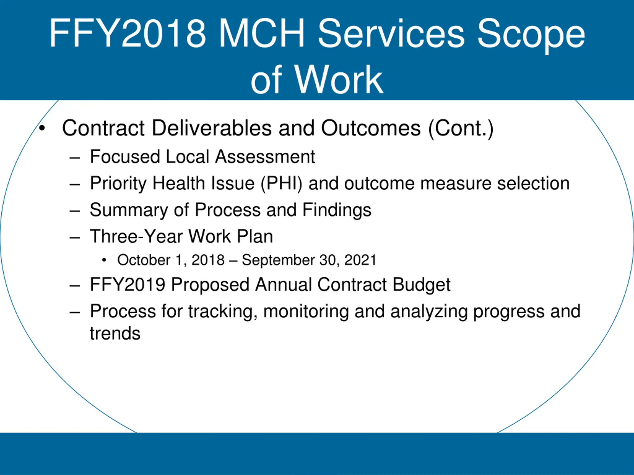 FFY2018 MCH Services Scope of Work Contract Deliverables and Outcomes (Cont.) Focused Local Assessment Priority Health Issue (PHI) and outcome measure selection Summary of Process and Findings Three-Year Work Plan October 1, 2018 September 30, 2021 FFY2019 Proposed Annual Contract Budget Process for tracking, monitoring and analyzing progress and trends
