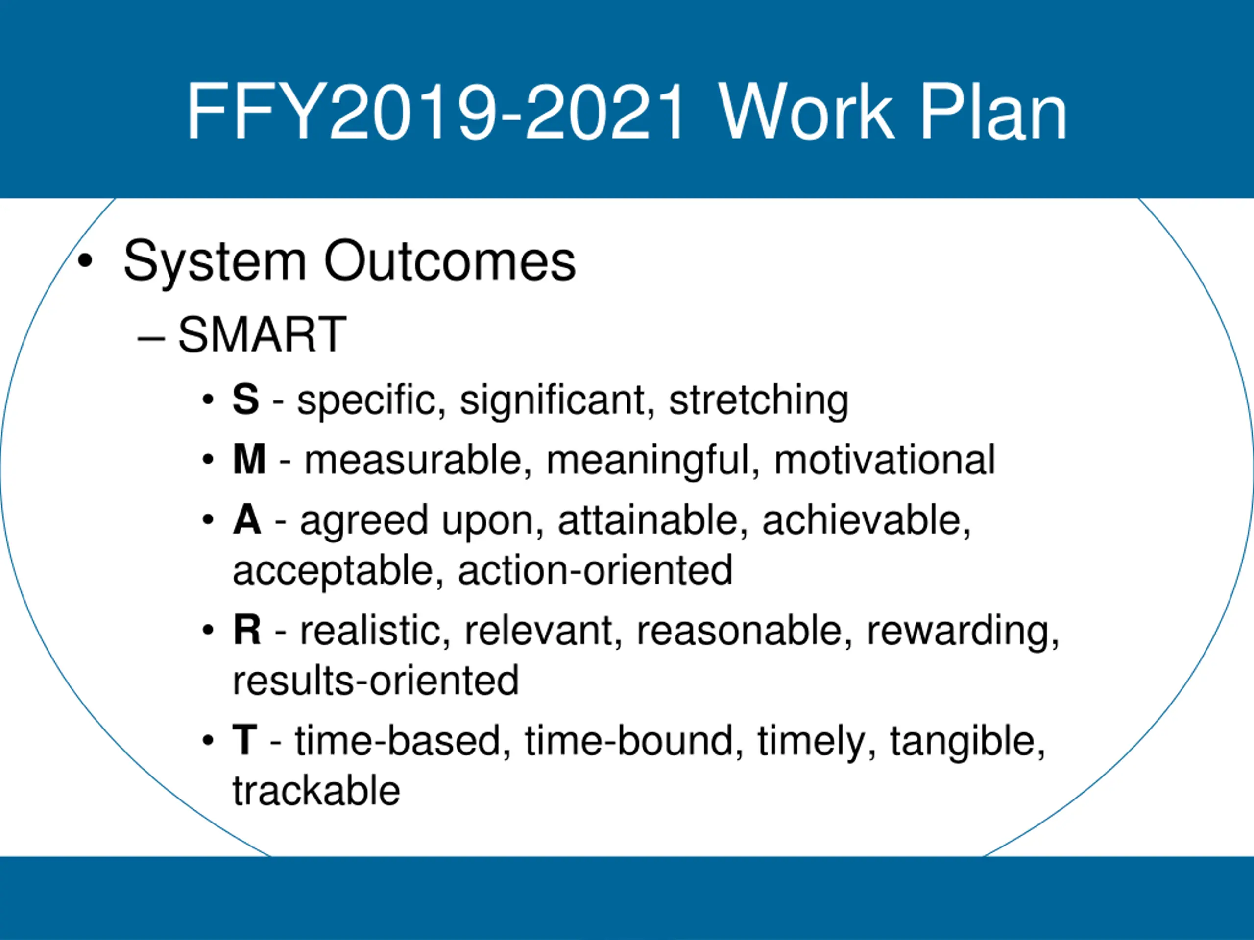 FFY2019-2021 Work Plan System Outcomes SMART S - specific, significant, stretching M - measurable, meaningful, motivational A - agreed upon, attainable, achievable, acceptable, action-oriented R - realistic, relevant, reasonable, rewarding, results-oriented T - time-based, time-bound, timely, tangible, trackable