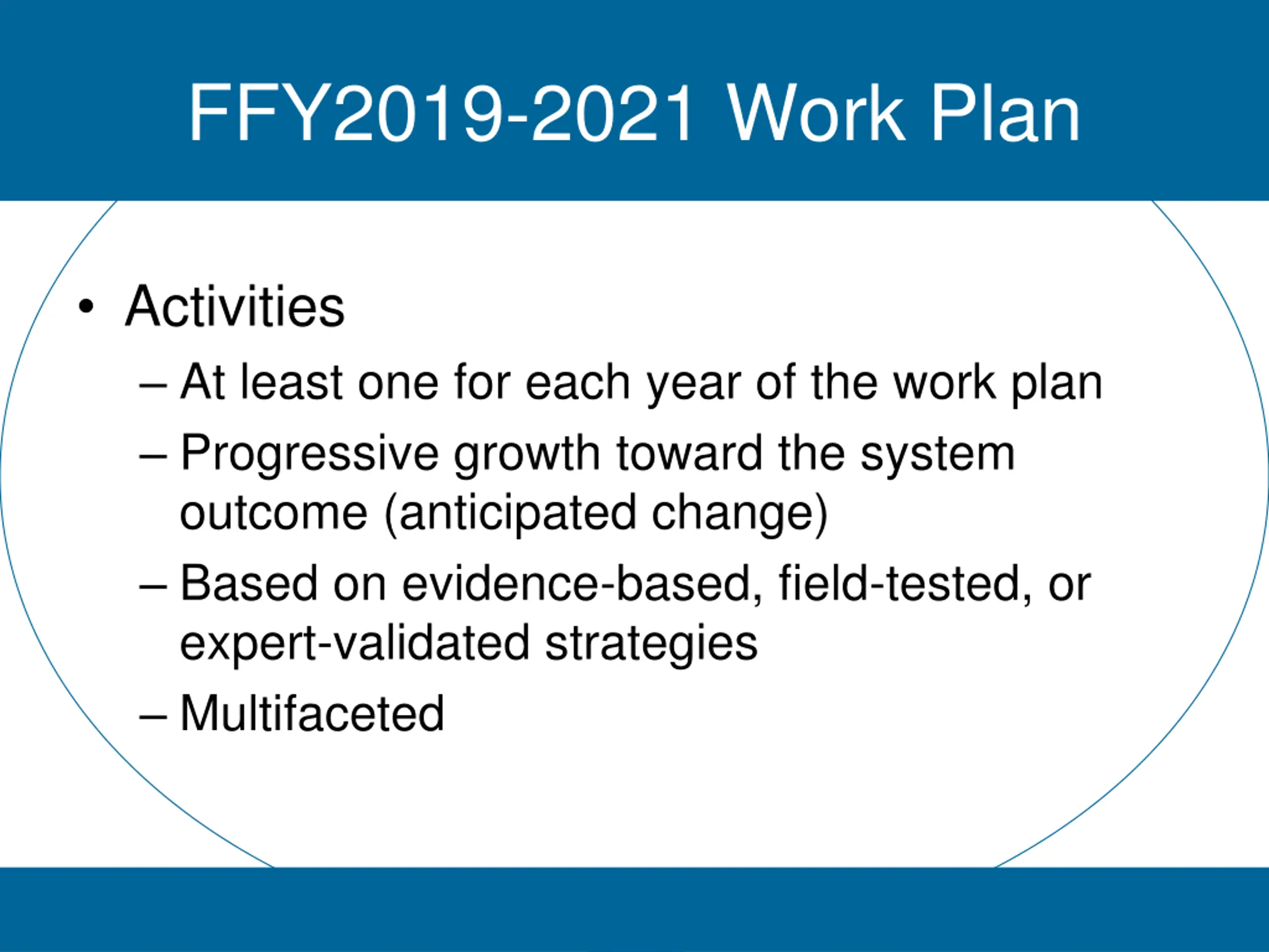 FFY2019-2021 Work Plan Activities At least one for each year of the work plan Progressive growth toward the system outcome (anticipated change) Based on evidence-based, field-tested, or expert-validated strategies Multifaceted
