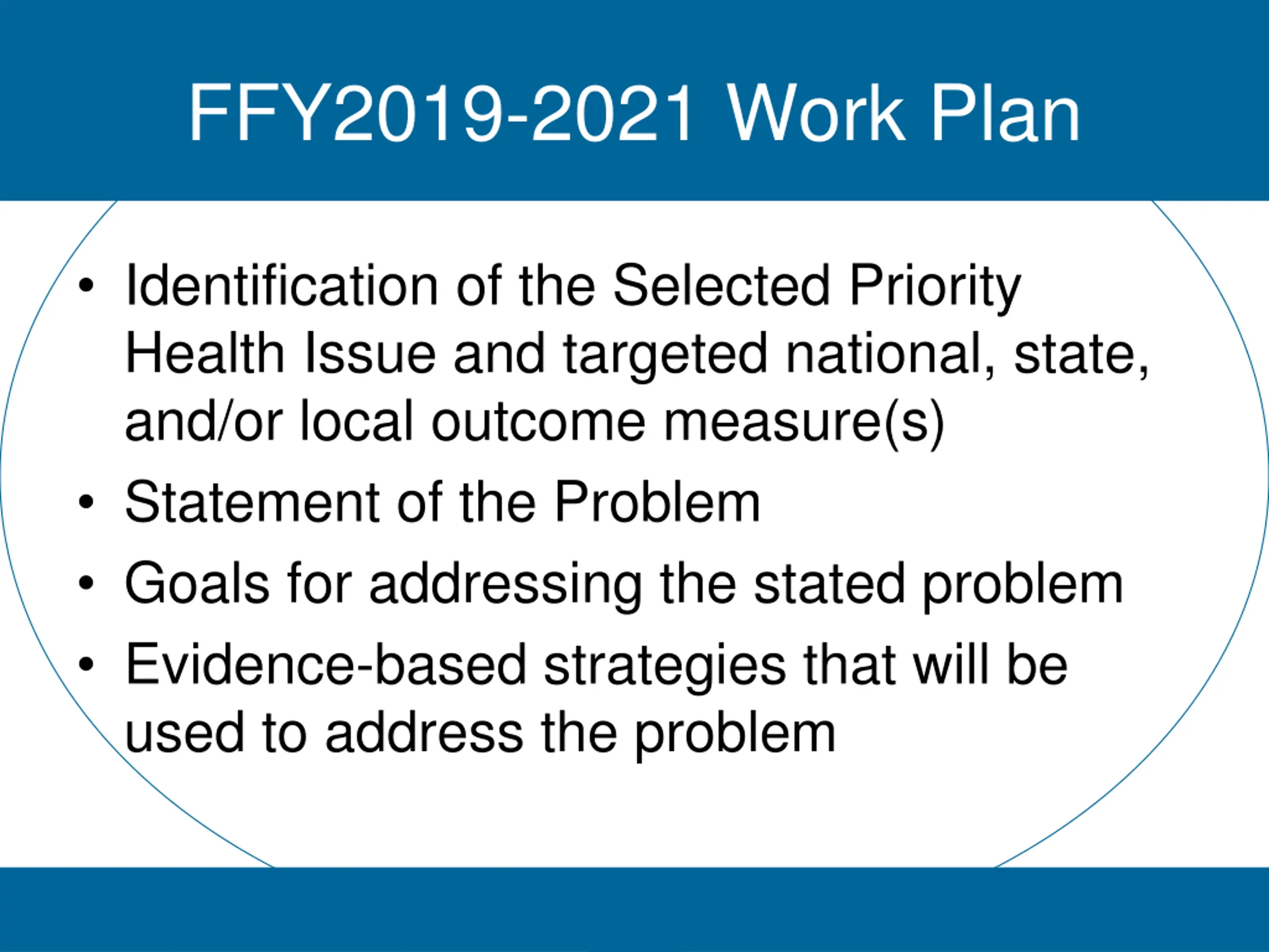 FFY2019-2021 Work Plan Identification of the Selected Priority Health Issue and targeted national, state, and/or local outcome measure(s) Statement of the Problem Goals for addressing the stated problem Evidence-based strategies that will be used to address the problem