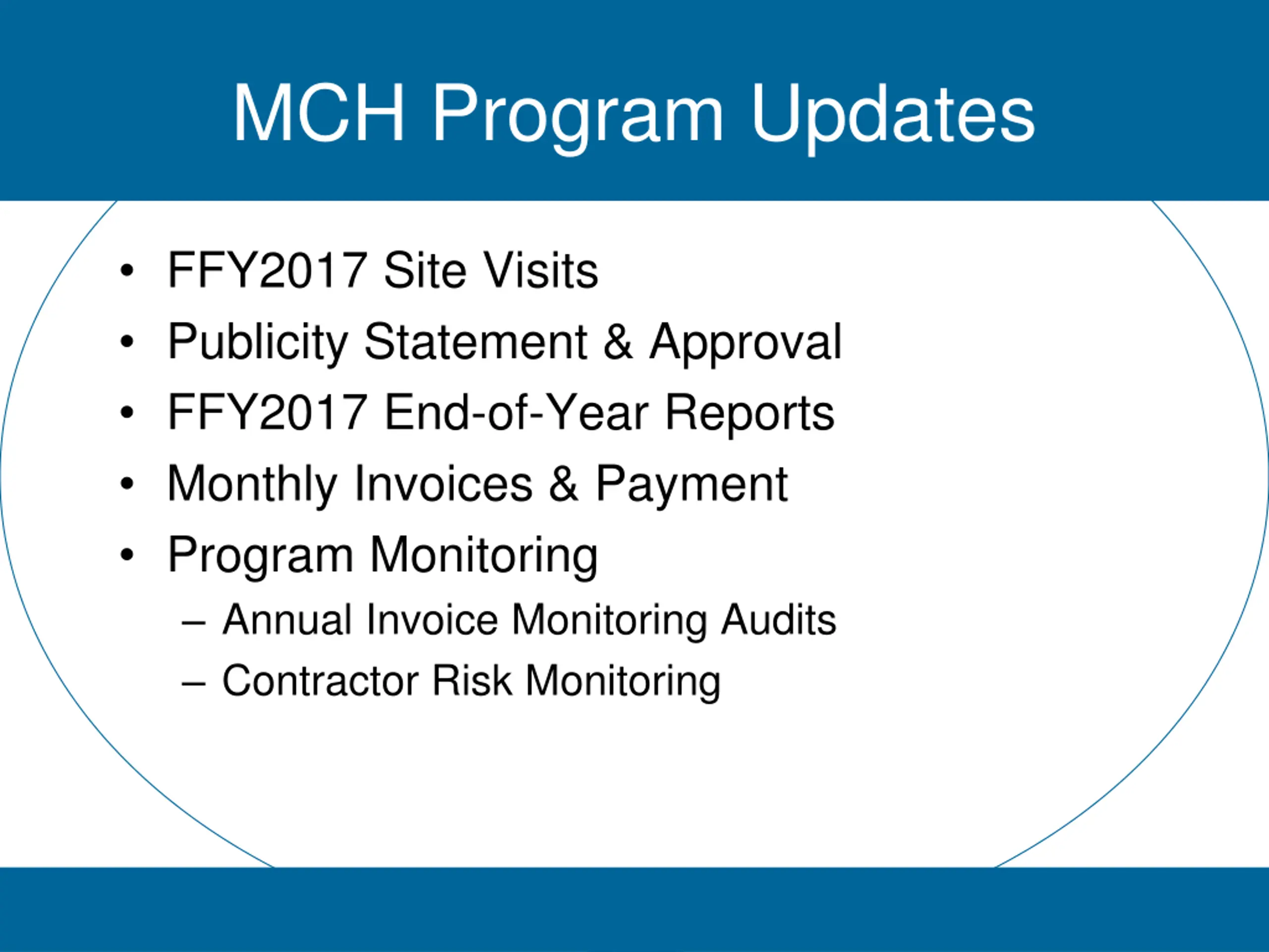 MCH Program Updates FFY2017 Site Visits Publicity Statement & Approval FFY2017 End-of-Year Reports Monthly Invoices & Payment Program Monitoring Annual Invoice Monitoring Audits Contractor Risk Monitoring