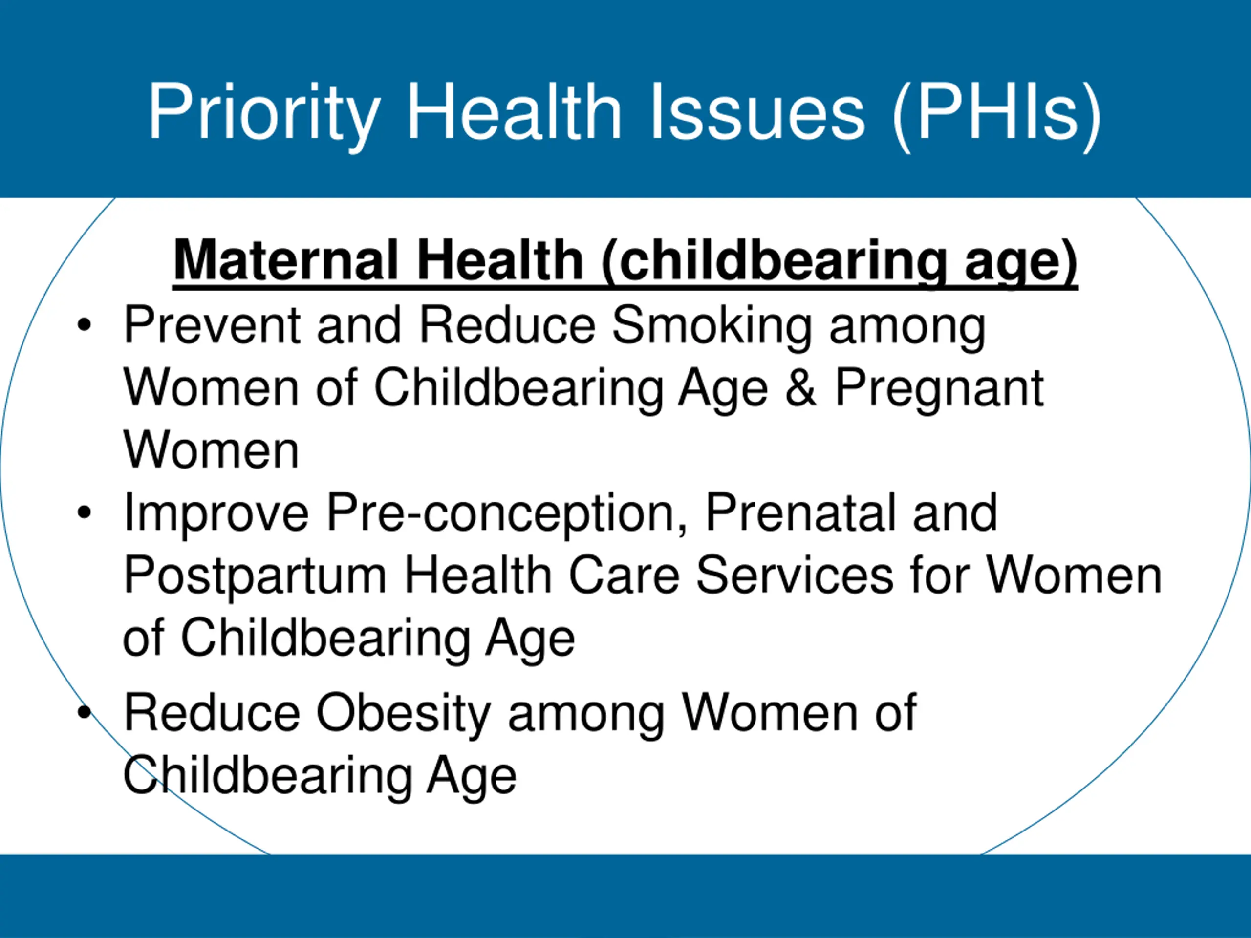 Priority Health Issues (PHIs) Maternal Health (childbearing age) Prevent and Reduce Smoking among Women of Childbearing Age & Pregnant Women Improve Pre-conception, Prenatal and Postpartum Health Care Services for Women of Childbearing Age Reduce Obesity among Women of Childbearing Age
