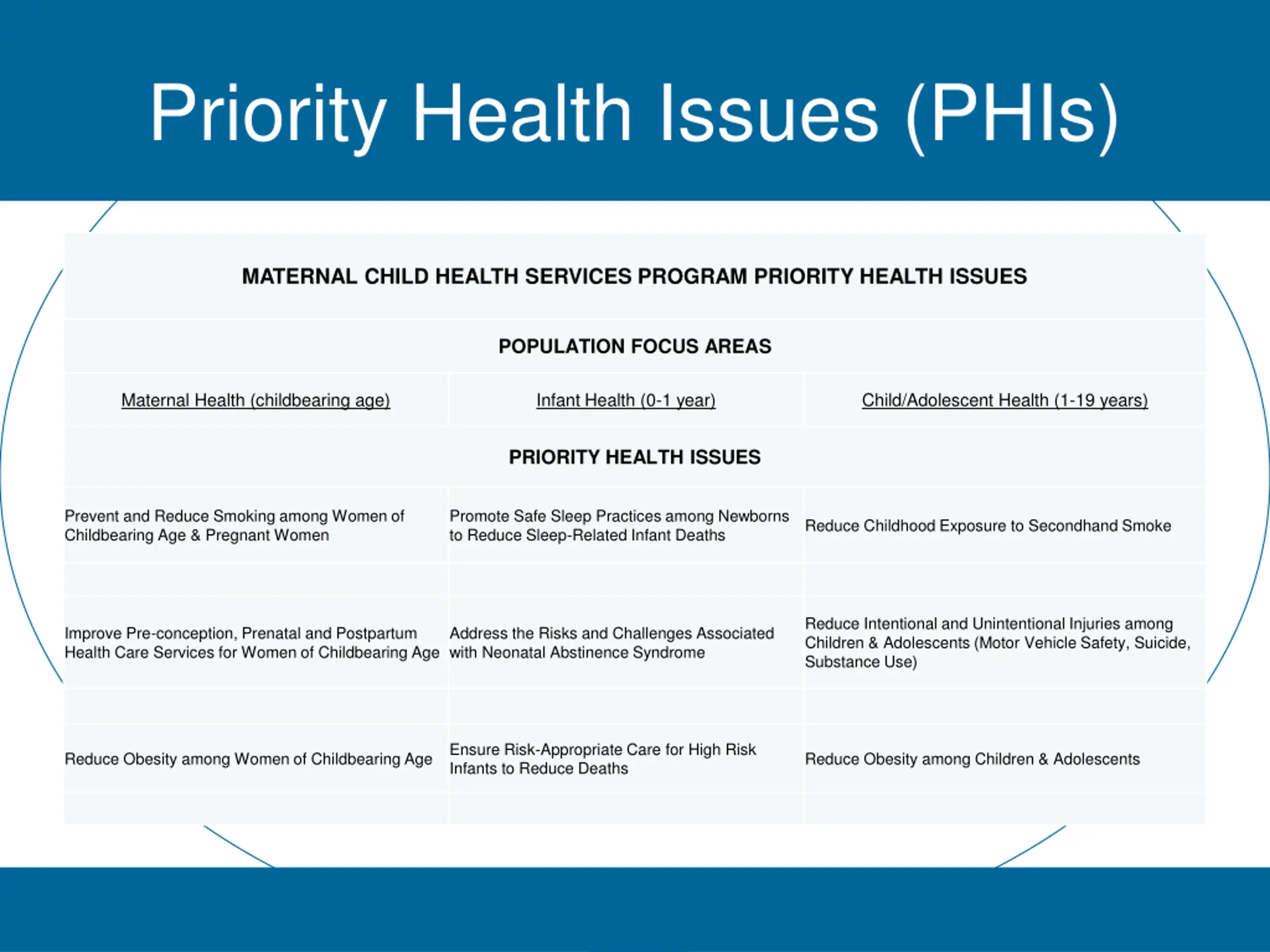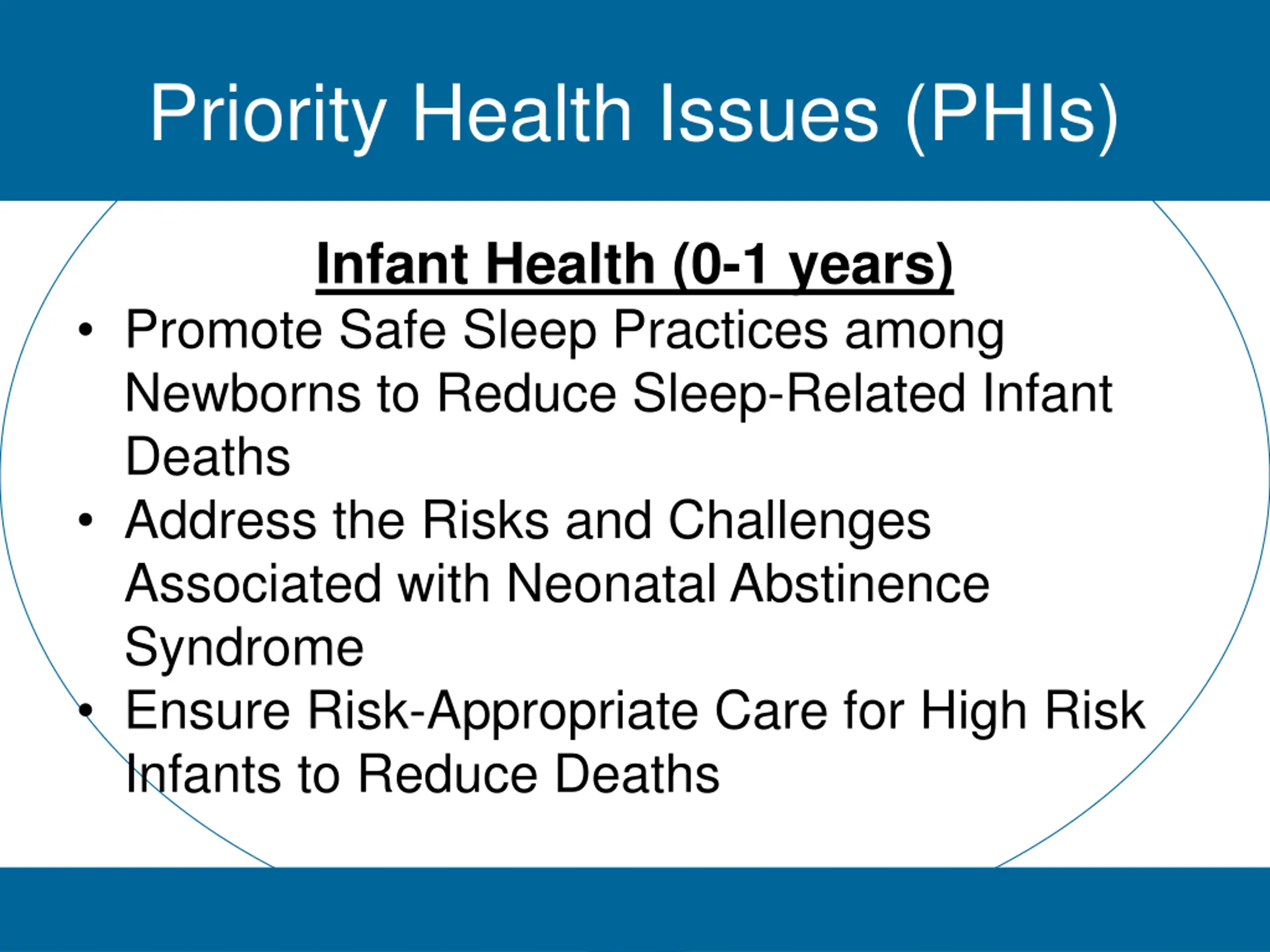 Priority Health Issues (PHIs) Infant Health (0-1 years) Promote Safe Sleep Practices among Newborns to Reduce Sleep-Related Infant Deaths Address the Risks and Challenges Associated with Neonatal Abstinence Syndrome Ensure Risk-Appropriate Care for High Risk Infants to Reduce Deaths