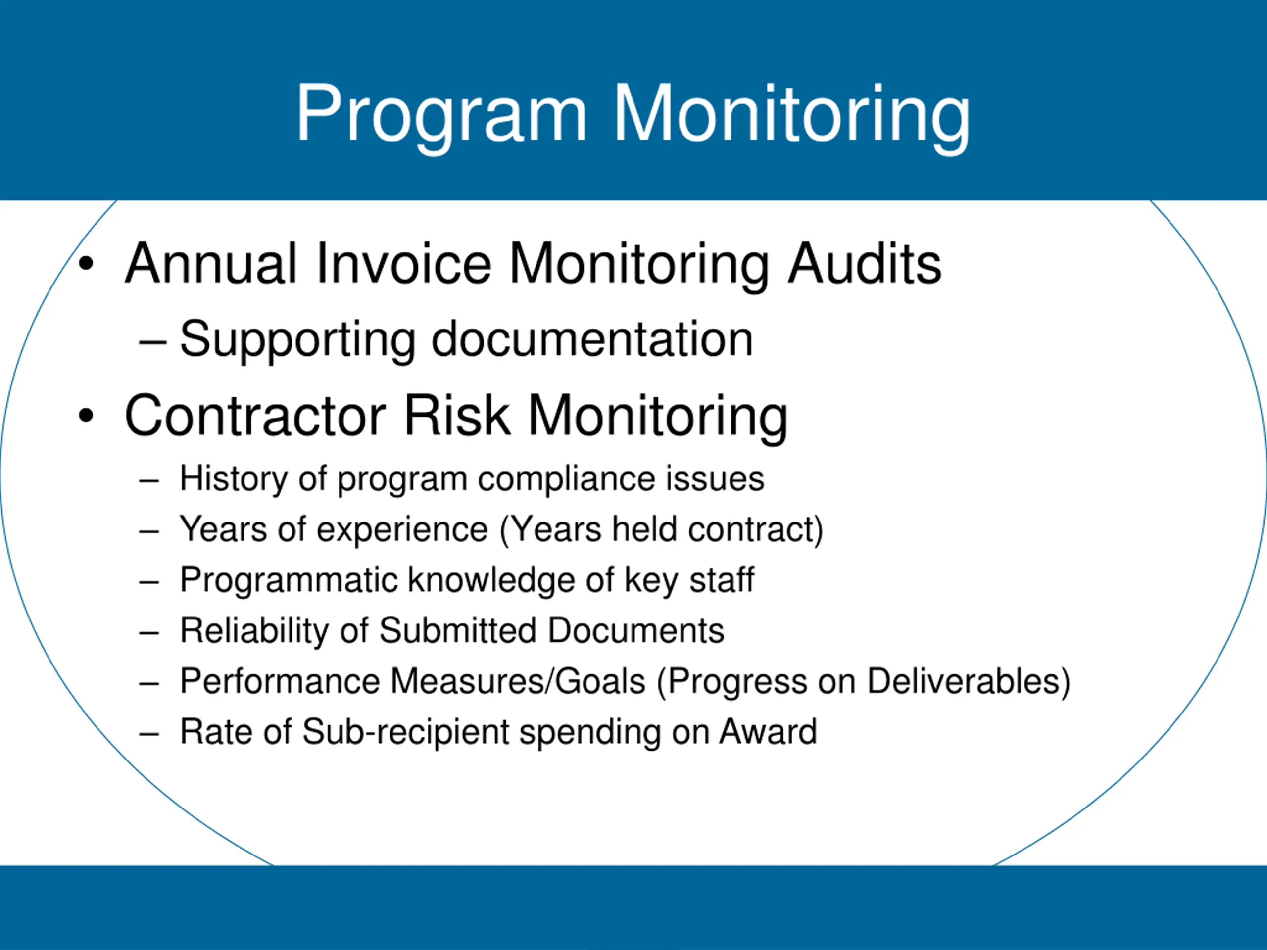 Program Monitoring Annual Invoice Monitoring Audits Supporting documentation Contractor Risk Monitoring History of program compliance issues Years of experience (Years held contract) Programmatic knowledge of key staff Reliability of Submitted Documents Performance Measures/Goals (Progress on Deliverables) Rate of Sub-recipient spending on Award