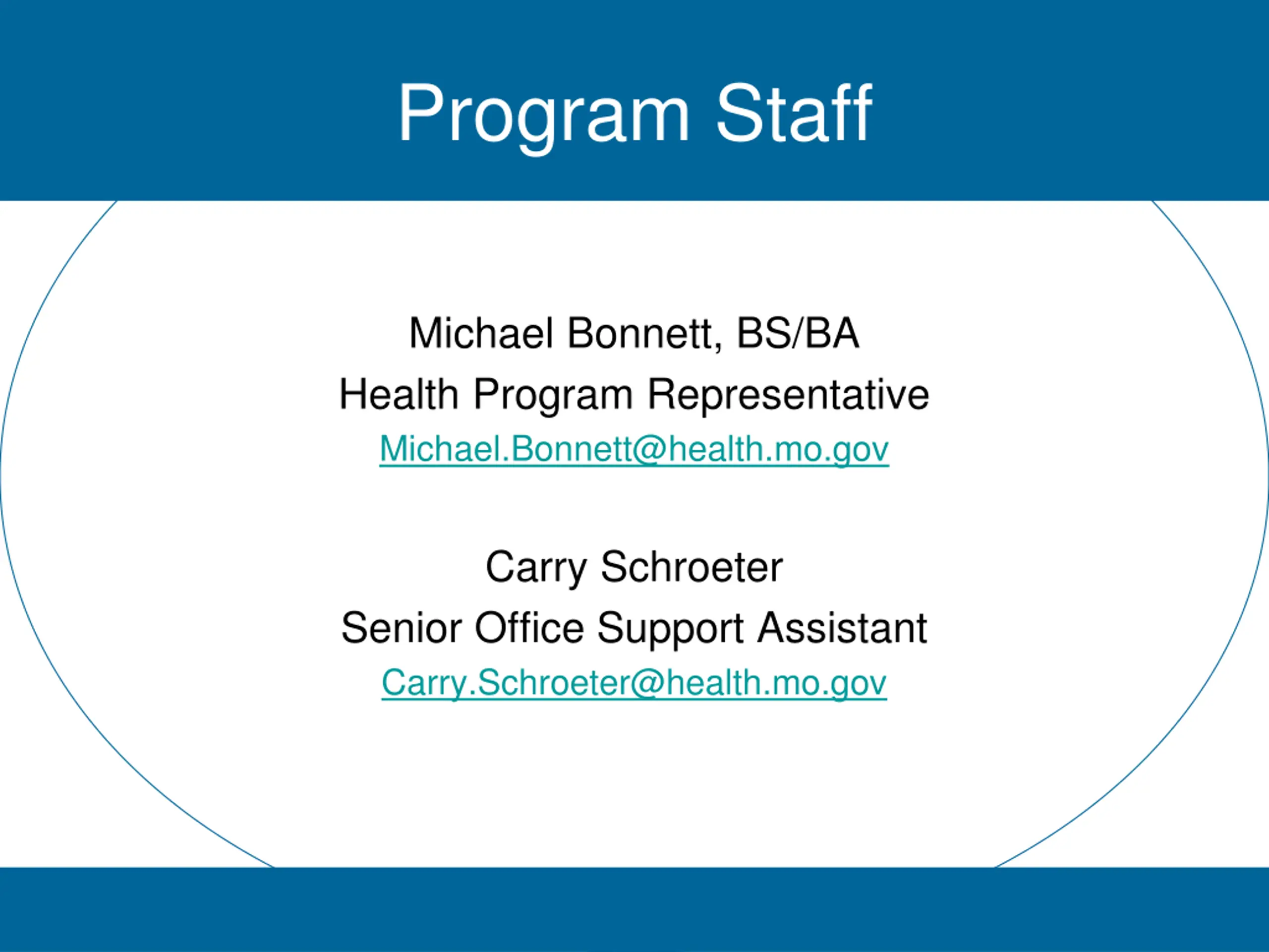 Program Staff Michael Bonnett, BS/BA Health Program Representative Michael.Bonnett@health.mo.gov Carry Schroeter Senior Office Support Assistant Carry.Schroeter@health.mo.gov