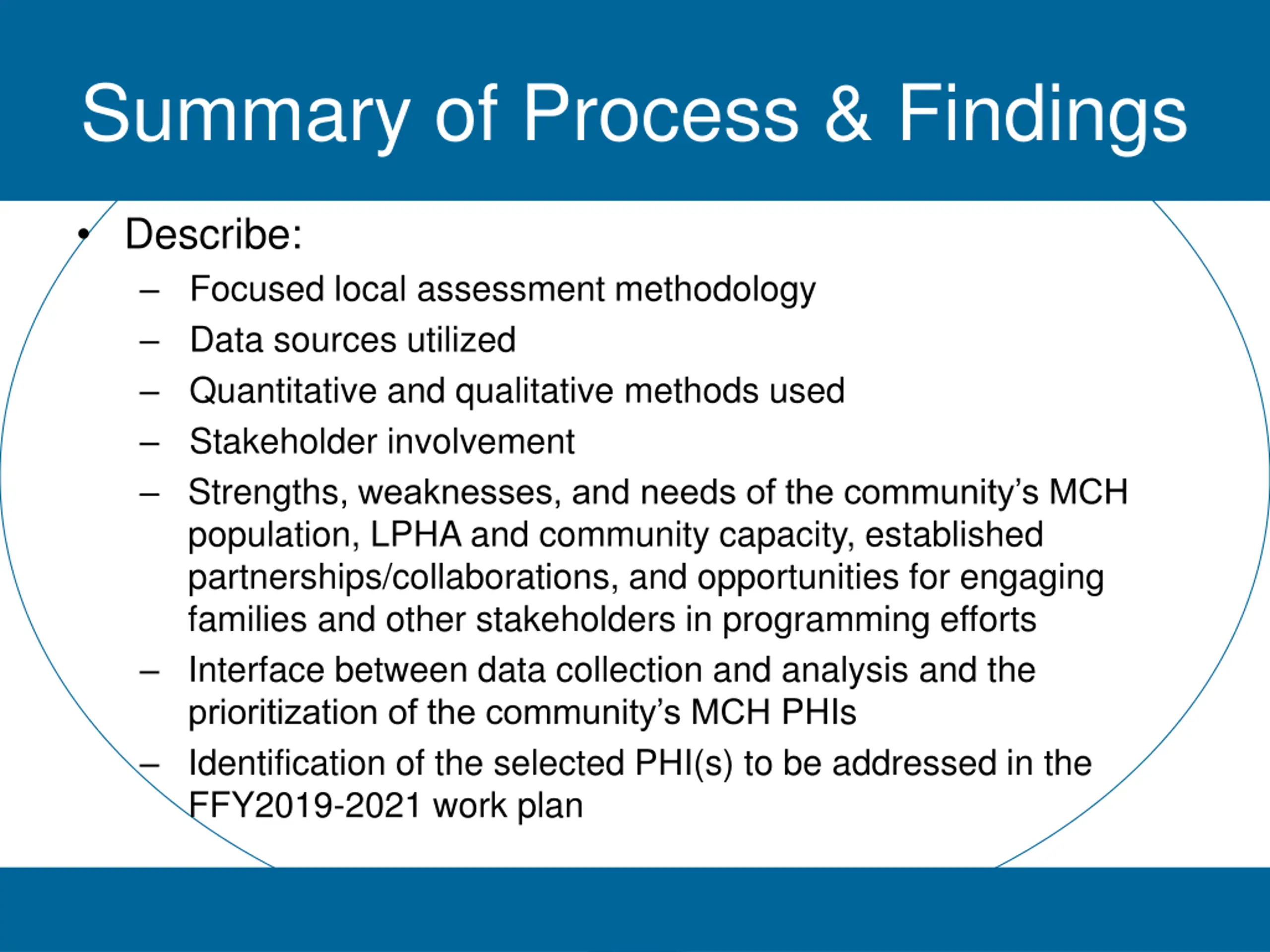 Summary of Process & Findings Describe: Focused local assessment methodology Data sources utilized Quantitative and qualitative methods used Stakeholder involvement Strengths, weaknesses, and needs of the community s MCH population, LPHA and community capacity, established partnerships/collaborations, and opportunities for engaging families and other stakeholders in programming efforts Interface between data collection and analysis and the prioritization of the community s MCH PHIs Identification of the selected PHI(s) to be addressed in the FFY2019-2021 work plan