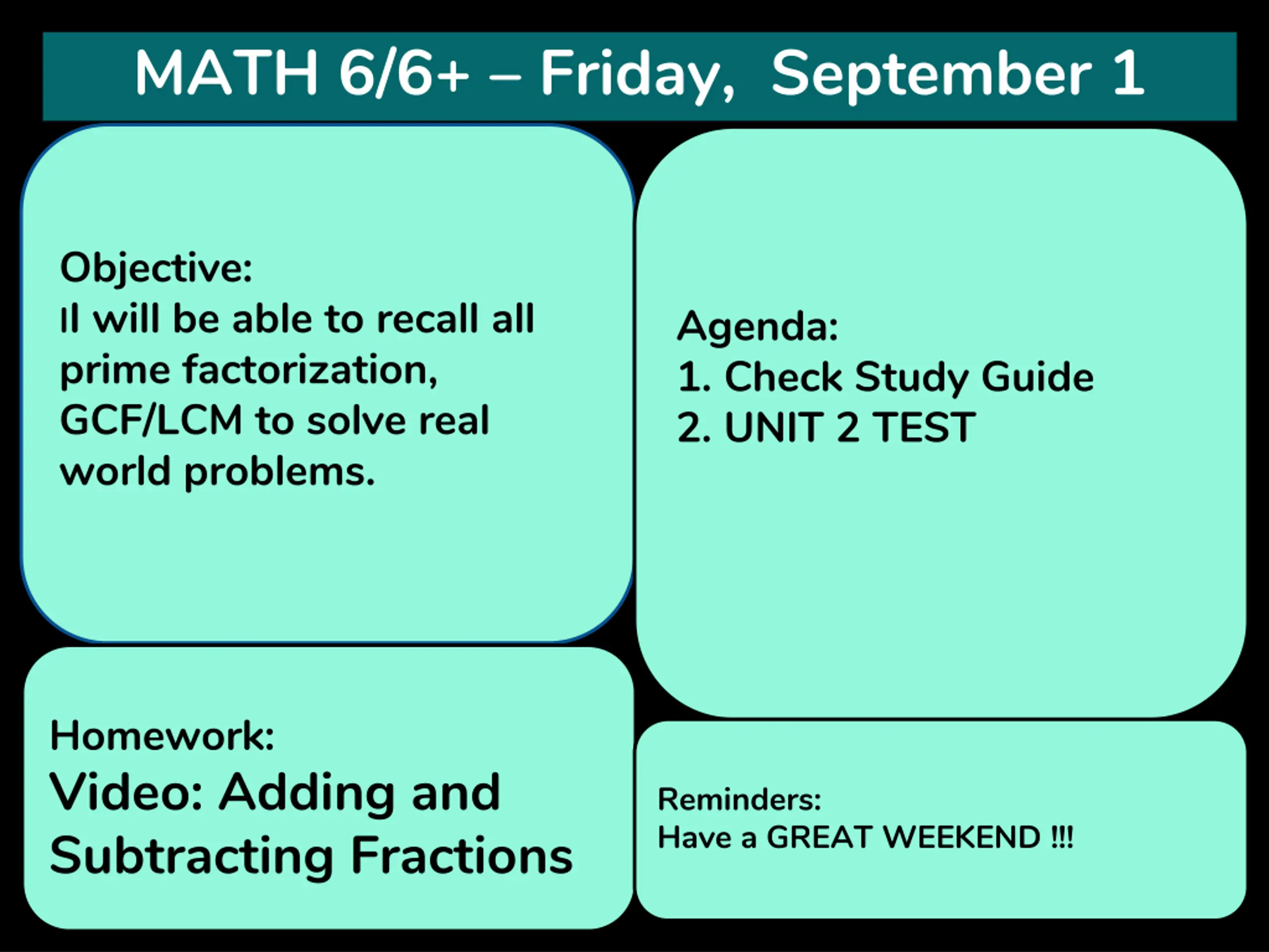 MATH 6/6+ Friday, September 1 Objective: II will be able to recall all prime factorization, GCF/LCM to solve real world problems. Agenda: 1. Check Study Guide 2. UNIT 2 TEST Homework: Video: Adding and Subtracting Fractions Reminders: Have a GREAT WEEKEND !!!