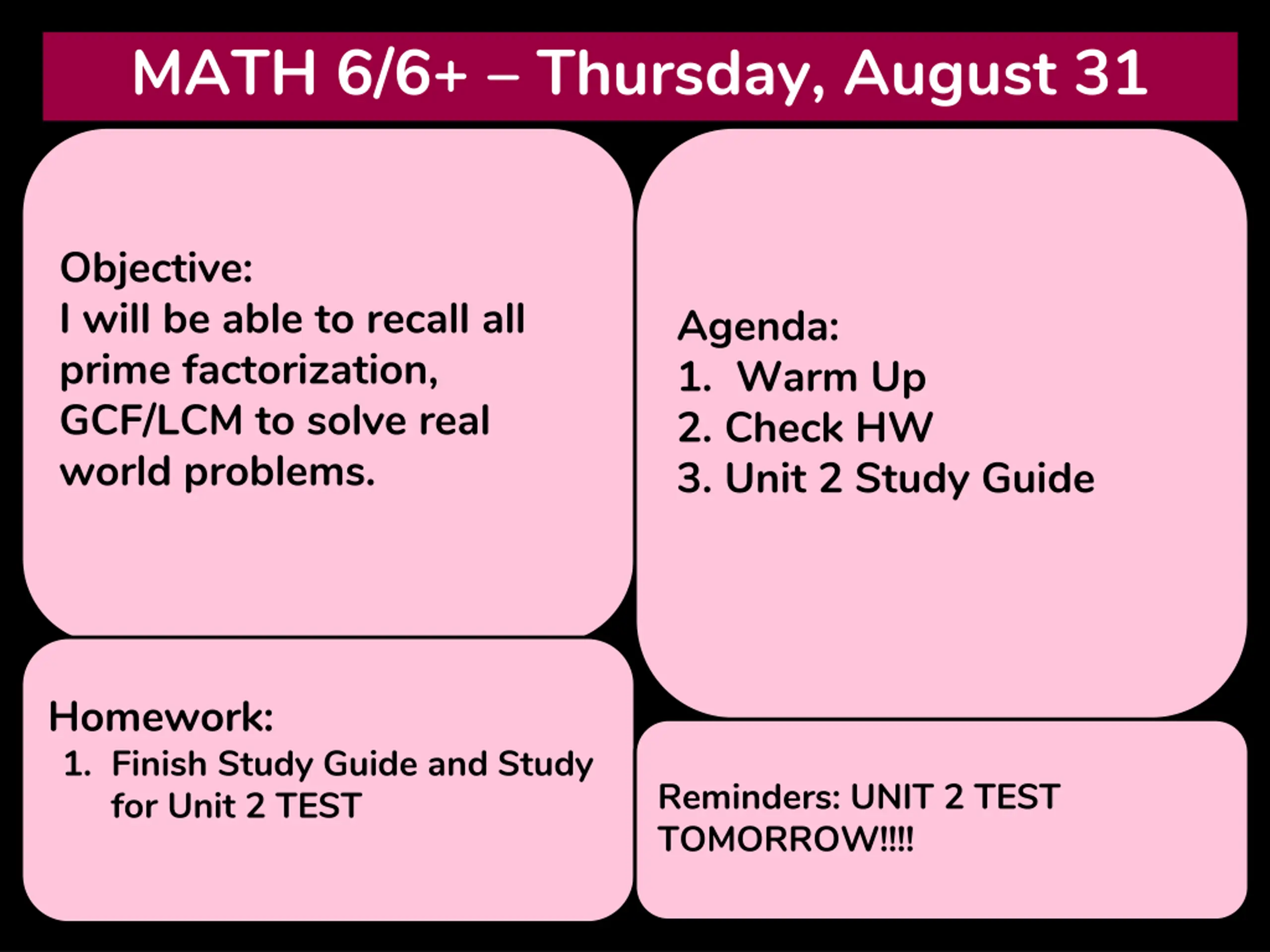 MATH 6/6+ Thursday, August 31 Objective: I will be able to recall all prime factorization, GCF/LCM to solve real world problems. Agenda: 1. Warm Up 2. Check HW 3. Unit 2 Study Guide Homework: 1. Finish Study Guide and Study for Unit 2 TEST Reminders: UNIT 2 TEST TOMORROW!!!!
