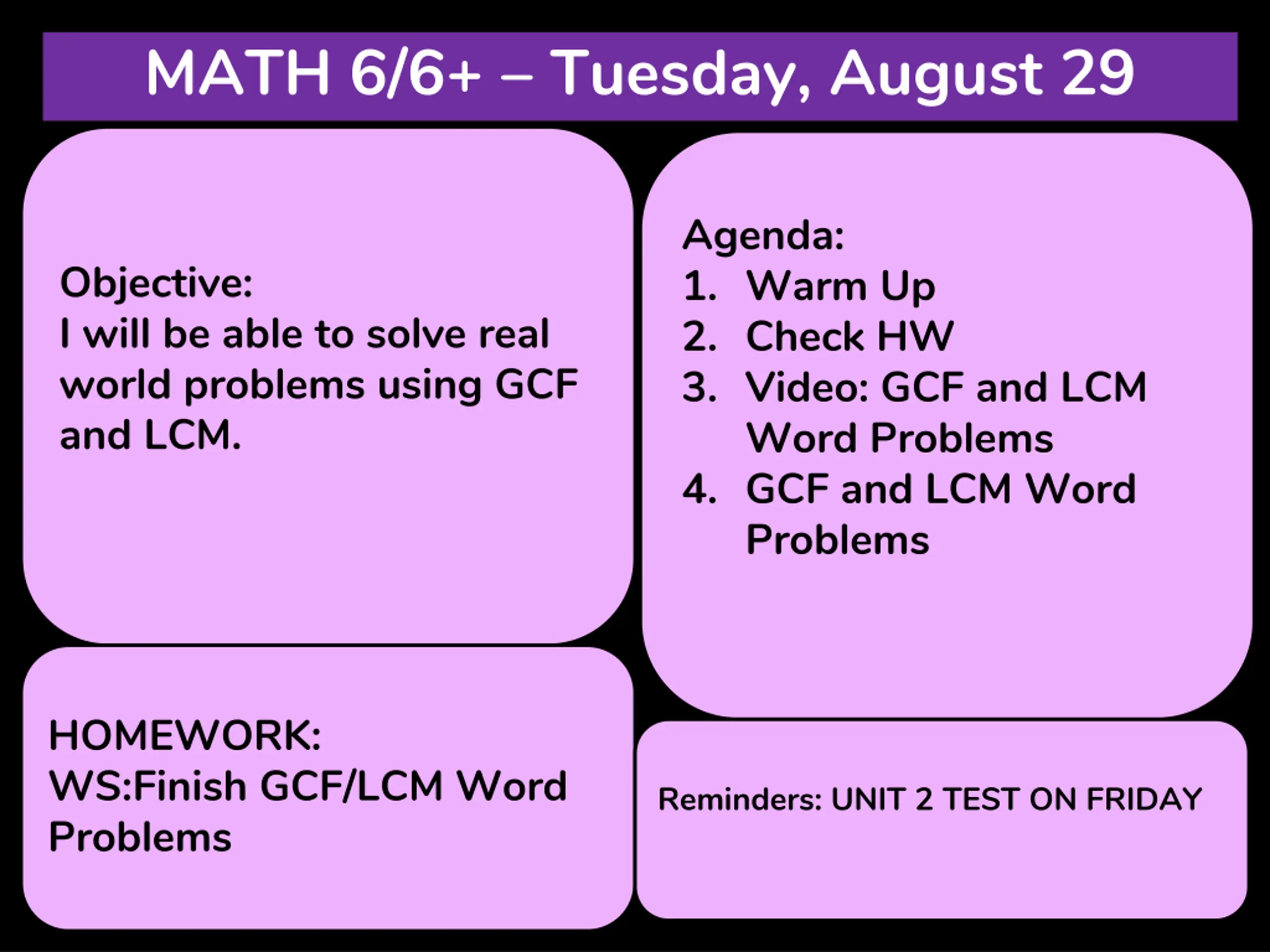 MATH 6/6+ Tuesday, August 29 Agenda: 1. Warm Up 2. Check HW 3. Video: GCF and LCM Word Problems 4. GCF and LCM Word Problems Objective: I will be able to solve real world problems using GCF and LCM. HOMEWORK: WS:Finish GCF/LCM Word Problems Reminders: UNIT 2 TEST ON FRIDAY