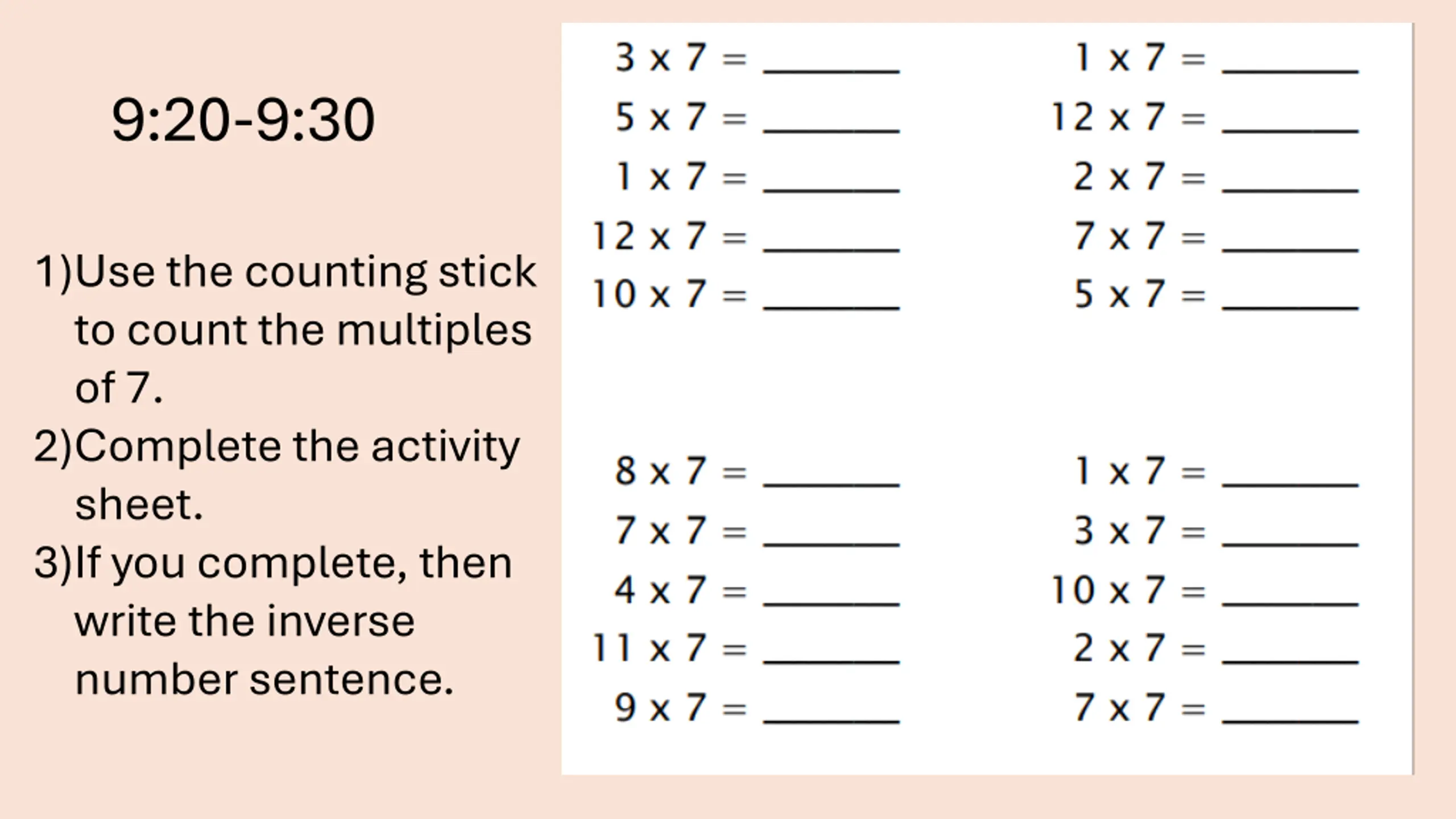 9:20-9:30 1)Use the counting stick to count the multiples of 7. 2)Complete the activity sheet. 3)If you complete, then write the inverse number sentence.