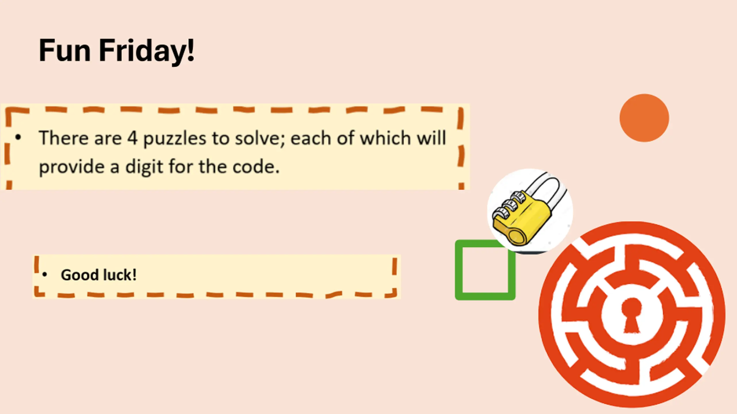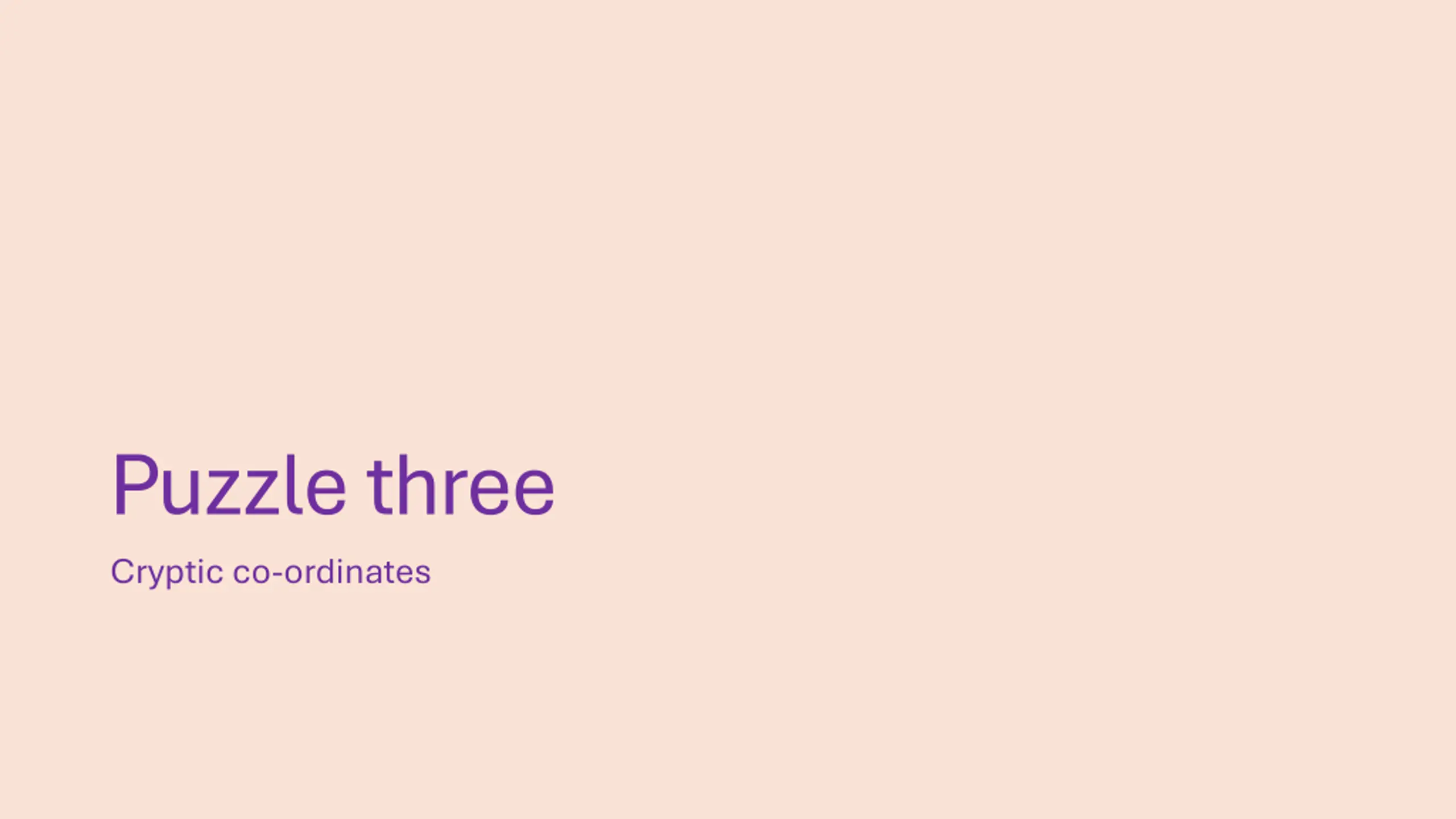 Cryptic co-ordinates Follow the co-ordinates to spell out a clue to the third digit of the code. 6 Q D U J Z E 5 T P N I Y M (1,5), (2,1), (4,5), (6,1), (2,6) 4 C O V Y T F 3 P W N A M L (1,3), (1,1), (3,1), (5,3), (6,6) 2 B S G C K S 1 R H I X E R 0 0 1 2 3 4 5 6 OAT MathOlympics Team Challenge Puzzle three