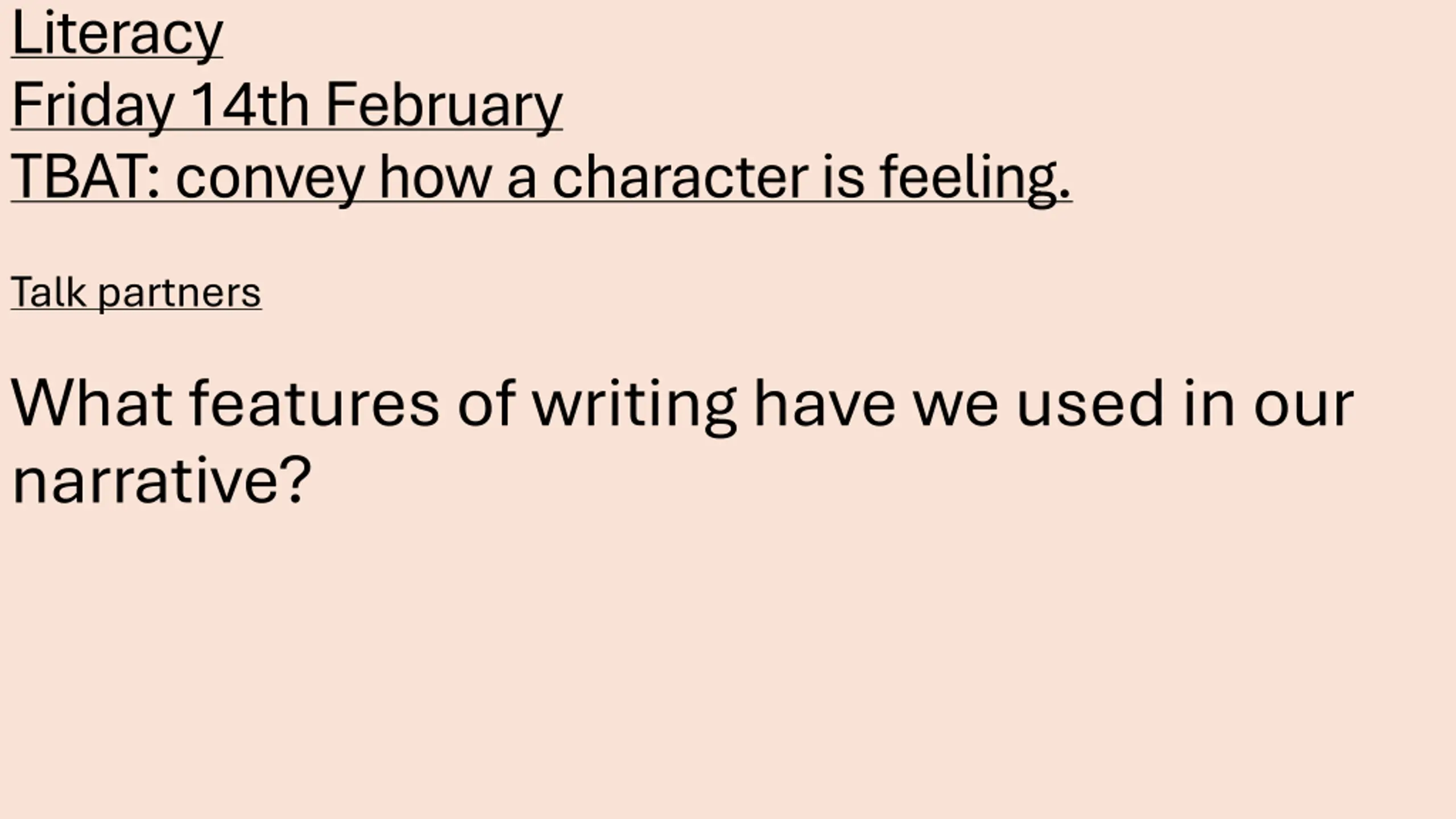 Literacy Friday 14th February TBAT: convey how a character is feeling. Talk partners What features of writing have we used in our narrative?