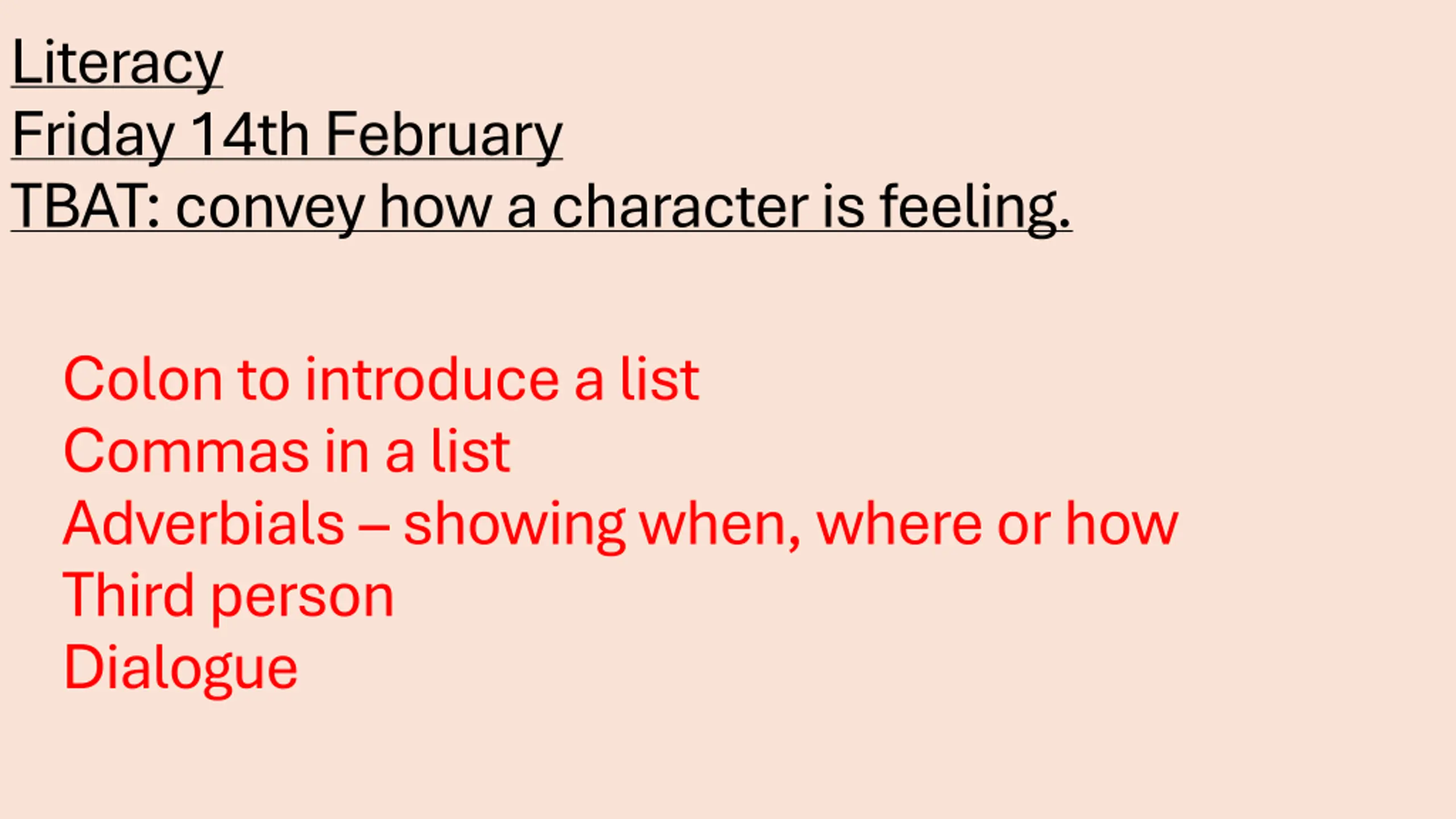 Literacy Friday 14th February TBAT: convey how a character is feeling. Colon to introduce a list Commas in a list Adverbials showing when, where or how Third person Dialogue