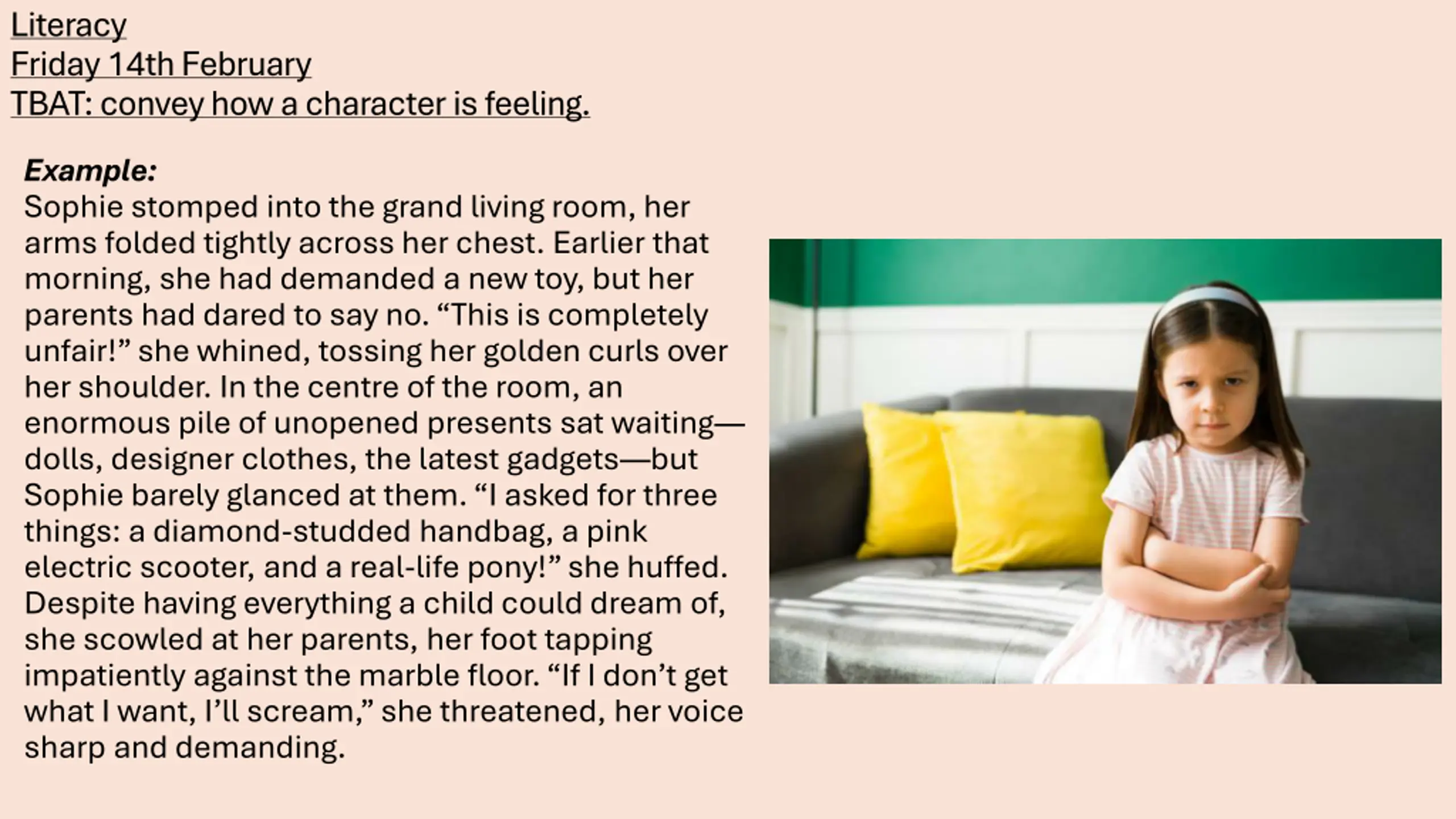 Literacy Friday 14th February TBAT: convey how a character is feeling. Example: Sophie stomped into the grand living room, her arms folded tightly across her chest. Earlier that morning, she had demanded a new toy, but her parents had dared to say no. This is completely unfair! she whined, tossing her golden curls over her shoulder. In the centre of the room, an enormous pile of unopened presents sat waiting dolls, designer clothes, the latest gadgets but Sophie barely glanced at them. I asked for three things: a diamond-studded handbag, a pink electric scooter, and a real-life pony! she huffed. Despite having everything a child could dream of, she scowled at her parents, her foot tapping impatiently against the marble floor. If I don t get what I want, I ll scream, she threatened, her voice sharp and demanding.