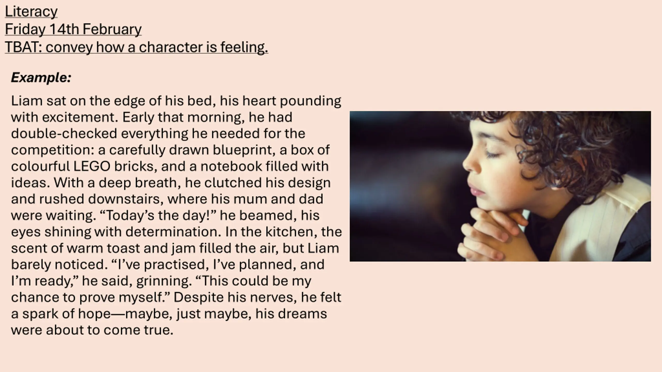 Literacy Friday 14th February TBAT: convey how a character is feeling. Example: Liam sat on the edge of his bed, his heart pounding with excitement. Early that morning, he had double-checked everything he needed for the competition: a carefully drawn blueprint, a box of colourful LEGO bricks, and a notebook filled with ideas. With a deep breath, he clutched his design and rushed downstairs, where his mum and dad were waiting. Today s the day! he beamed, his eyes shining with determination. In the kitchen, the scent of warm toast and jam filled the air, but Liam barely noticed. I ve practised, I ve planned, and I m ready, he said, grinning. This could be my chance to prove myself. Despite his nerves, he felt a spark of hope maybe, just maybe, his dreams were about to come true.