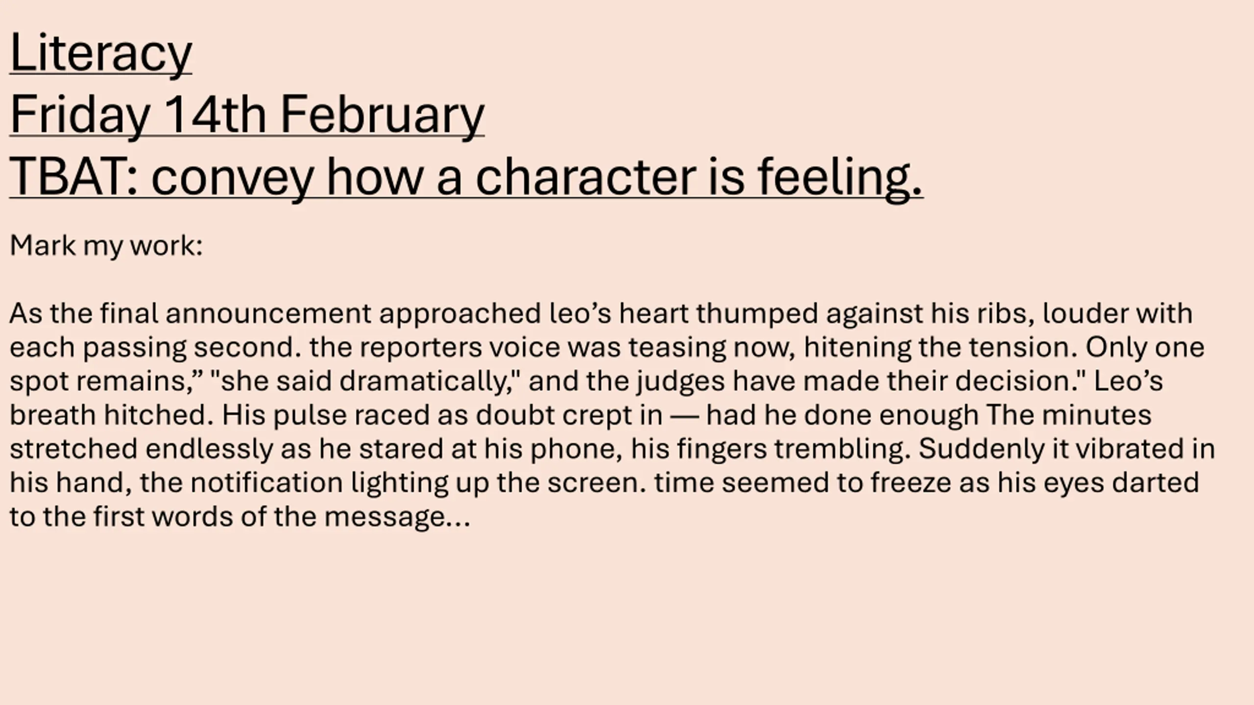 Literacy Friday 14th February TBAT: convey how a character is feeling. Mark my work: As the final announcement approached leo s heart thumped against his ribs, louder with each passing second. the reporters voice was teasing now, hitening the tension. Only one spot remains, "she said dramatically," and the judges have made their decision." Leo s breath hitched. His pulse raced as doubt crept in had he done enough The minutes stretched endlessly as he stared at his phone, his fingers trembling. Suddenly it vibrated in his hand, the notification lighting up the screen. time seemed to freeze as his eyes darted to the first words of the message...