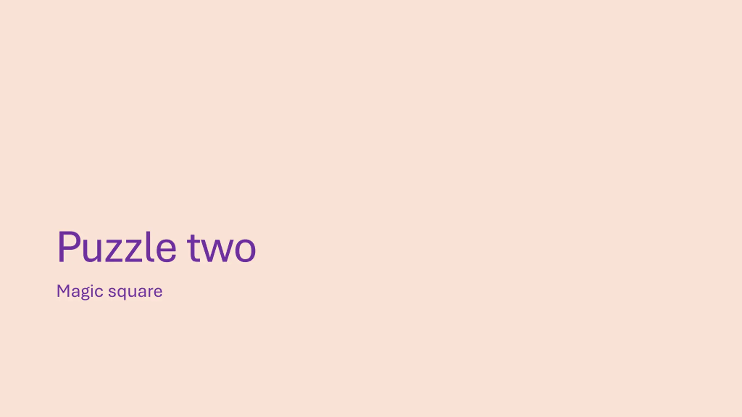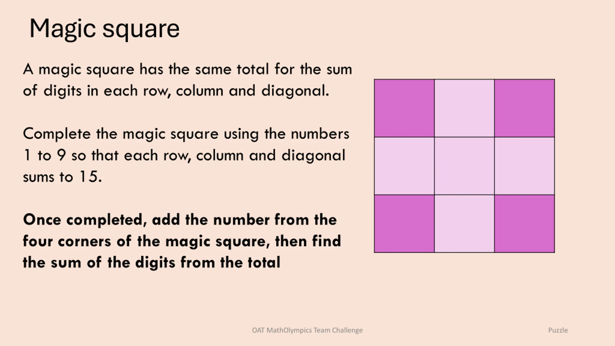 Magic square A magic square has the same total for the sum of digits in each row, column and diagonal. Complete the magic square using the numbers 1 to 9 so that each row, column and diagonal sums to 15. Once completed, add the number from the four corners of the magic square, then find the sum of the digits from the total OAT MathOlympics Team Challenge Puzzle