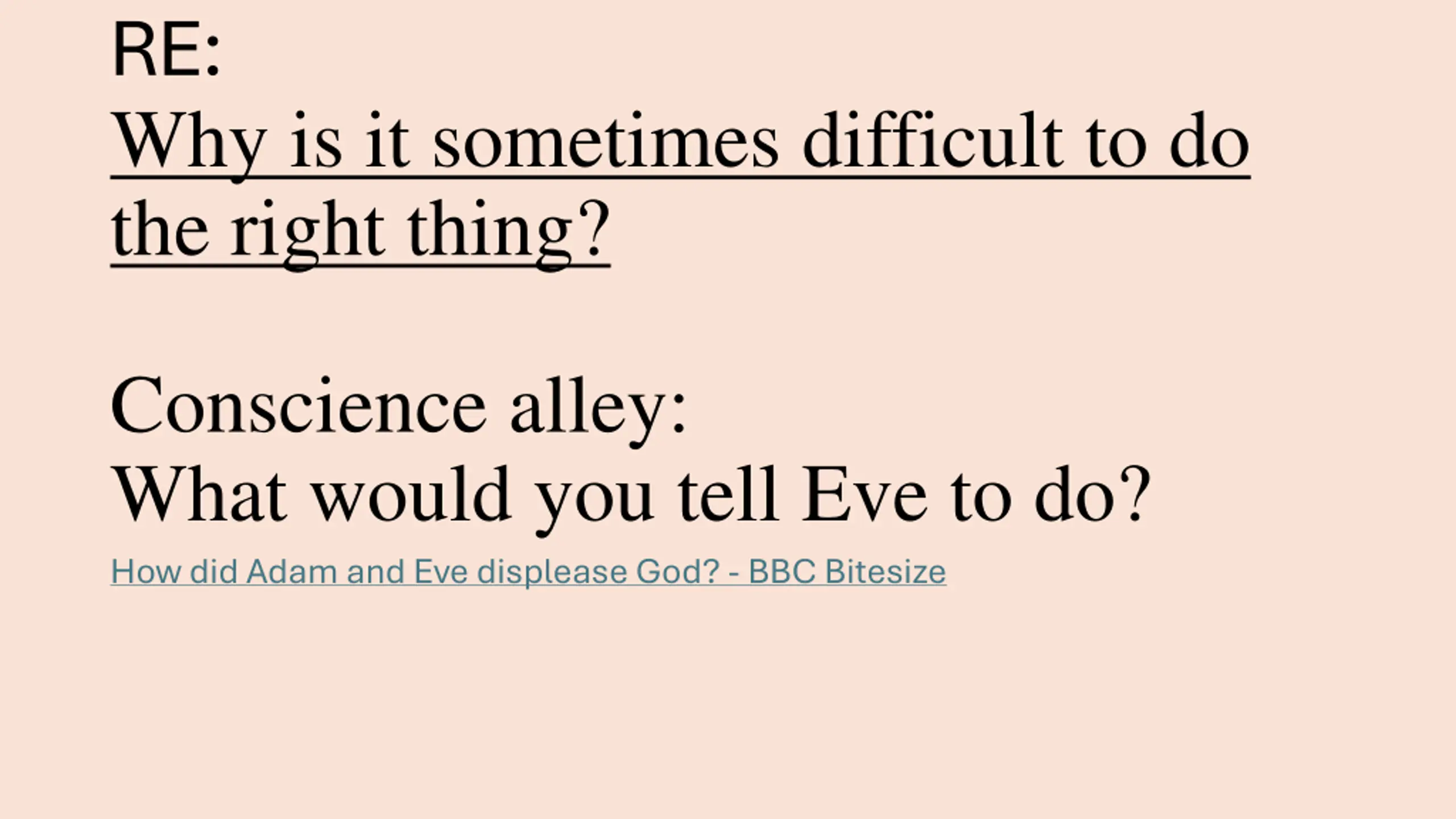 RE: Why is it sometimes difficult to do the right thing? Conscience alley: What would you tell Eve to do? How did Adam and Eve displease God? - BBC Bitesize