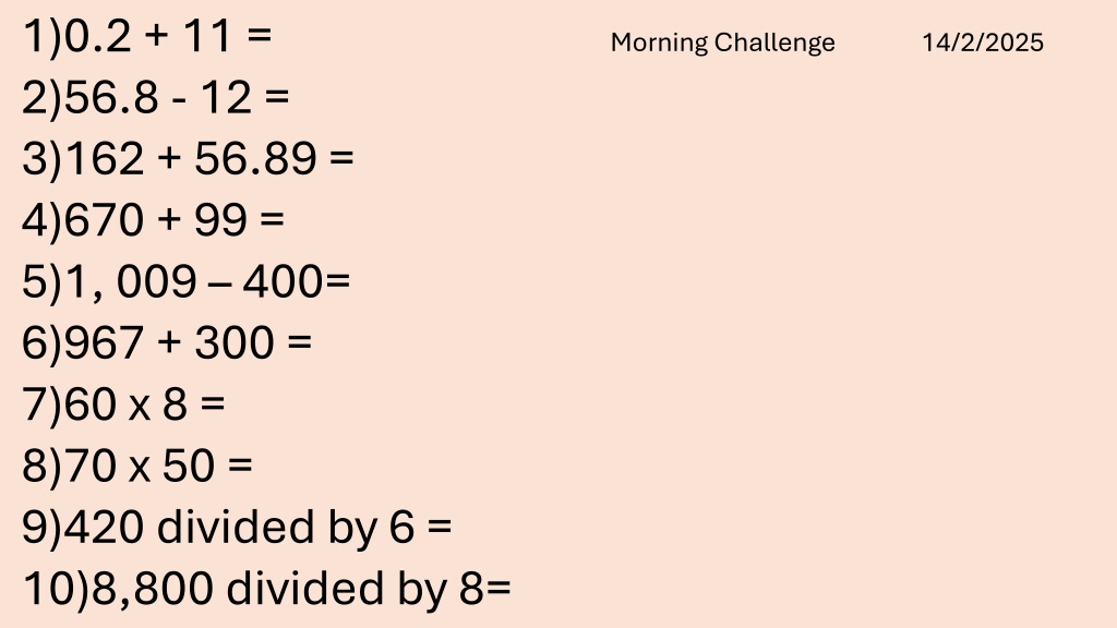 1)0.2 + 11 = 2)56.8 - 12 = 3)162 + 56.89 = 4)670 + 99 = 5)1, 009 400= 6)967 + 300 = 7)60 x 8 = 8)70 x 50 = 9)420 divided by 6 = 10)8,800 divided by 8= Morning Challenge 14/2/2025
