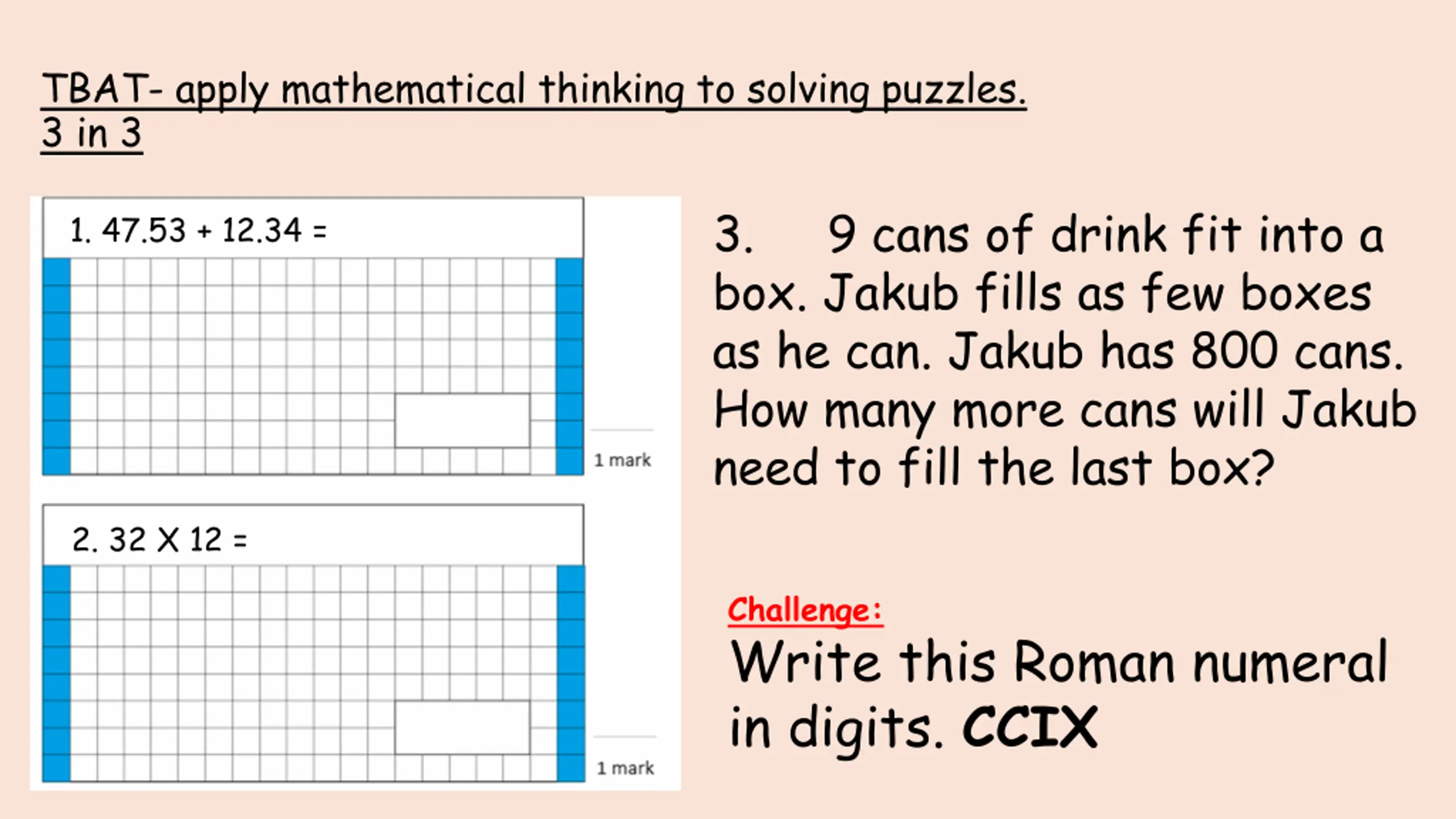 TBAT- apply mathematical thinking to solving puzzles. 3 in 3 3. 9 cans of drink fit into a box. Jakub fills as few boxes as he can. Jakub has 800 cans. How many more cans will Jakub need to fill the last box? 1. 47.53 + 12.34 = 2. 32 X 12 = Challenge: Write this Roman numeral in digits. CCIX