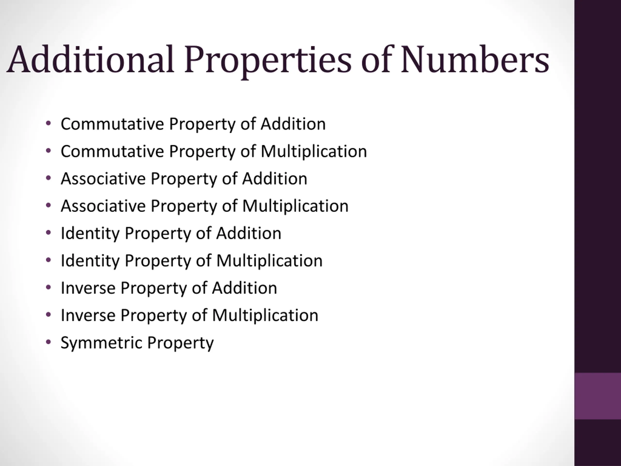 Additional Properties of Numbers Commutative Property of Addition Commutative Property of Multiplication Associative Property of Addition Associative Property of Multiplication Identity Property of Addition Identity Property of Multiplication Inverse Property of Addition Inverse Property of Multiplication Symmetric Property