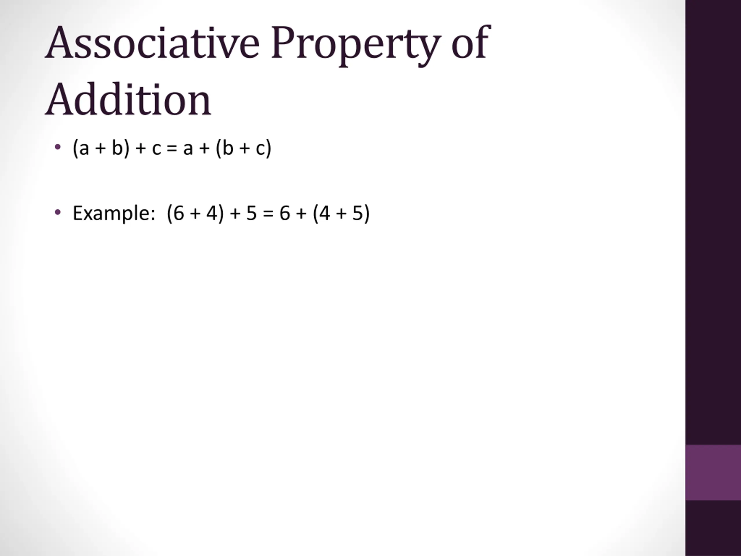 Associative Property of Addition (a + b) + c = a + (b + c) Example: (6 + 4) + 5 = 6 + (4 + 5)