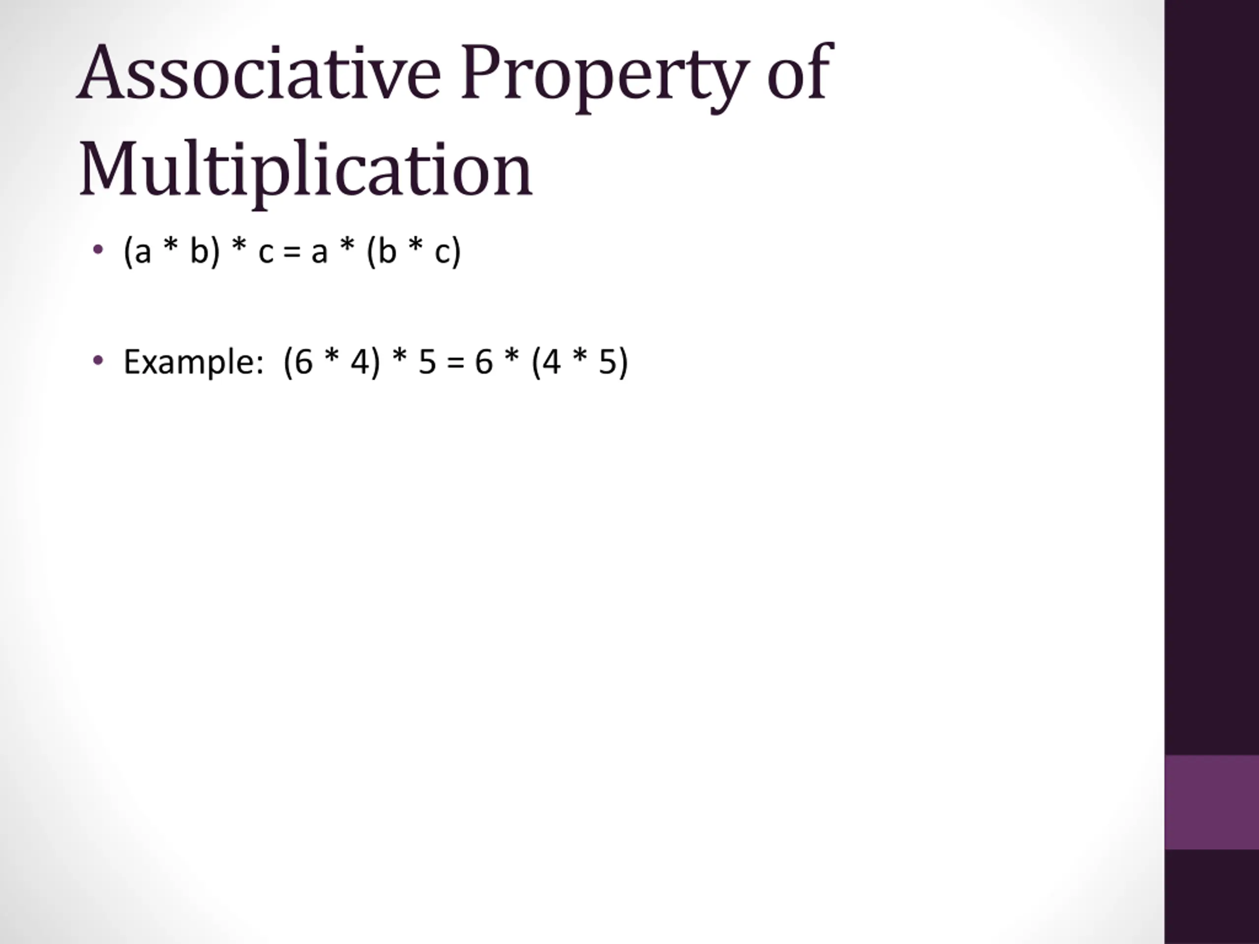 Associative Property of Multiplication (a * b) * c = a * (b * c) Example: (6 * 4) * 5 = 6 * (4 * 5)