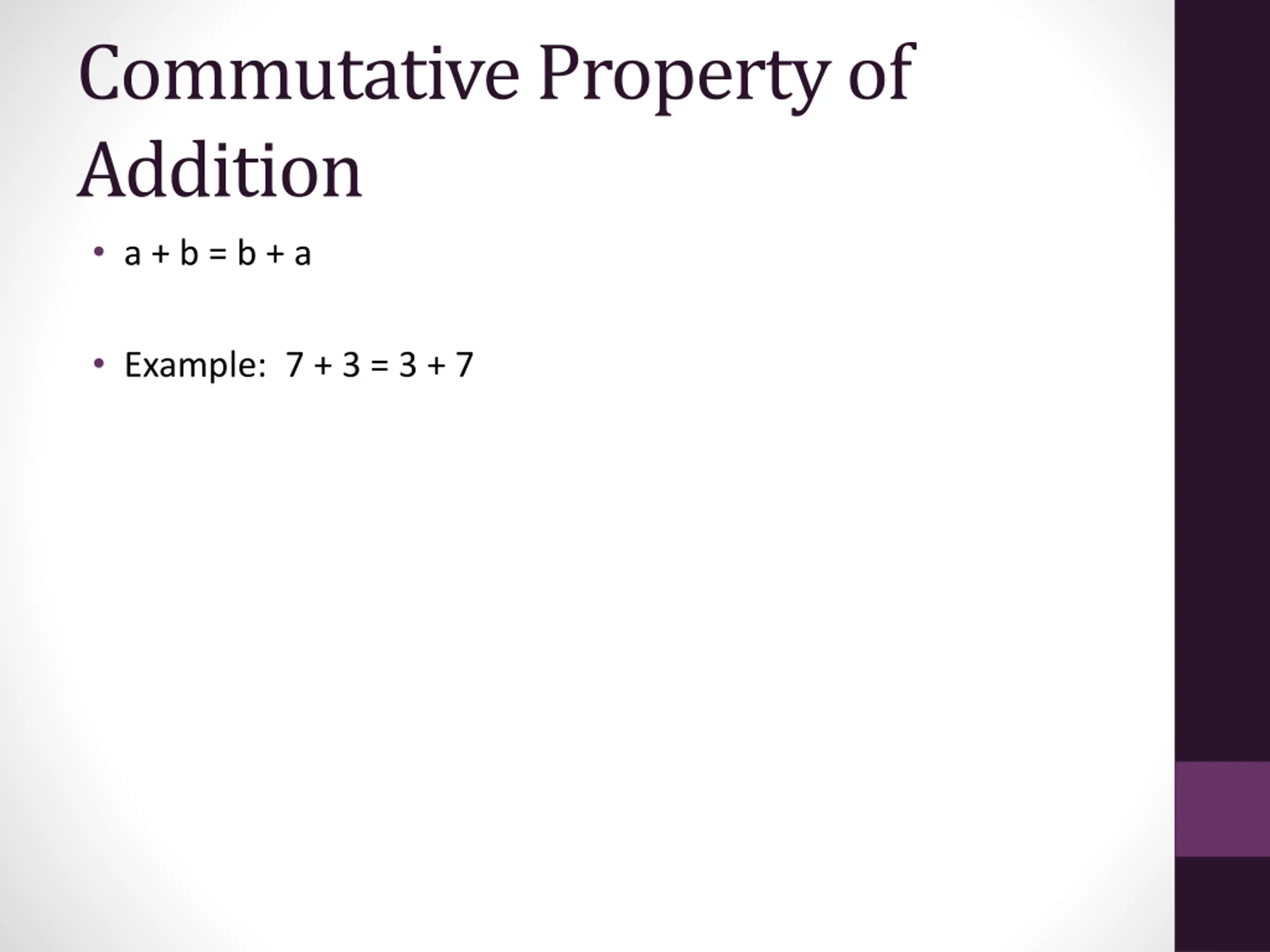 Commutative Property of Addition a + b = b + a Example: 7 + 3 = 3 + 7