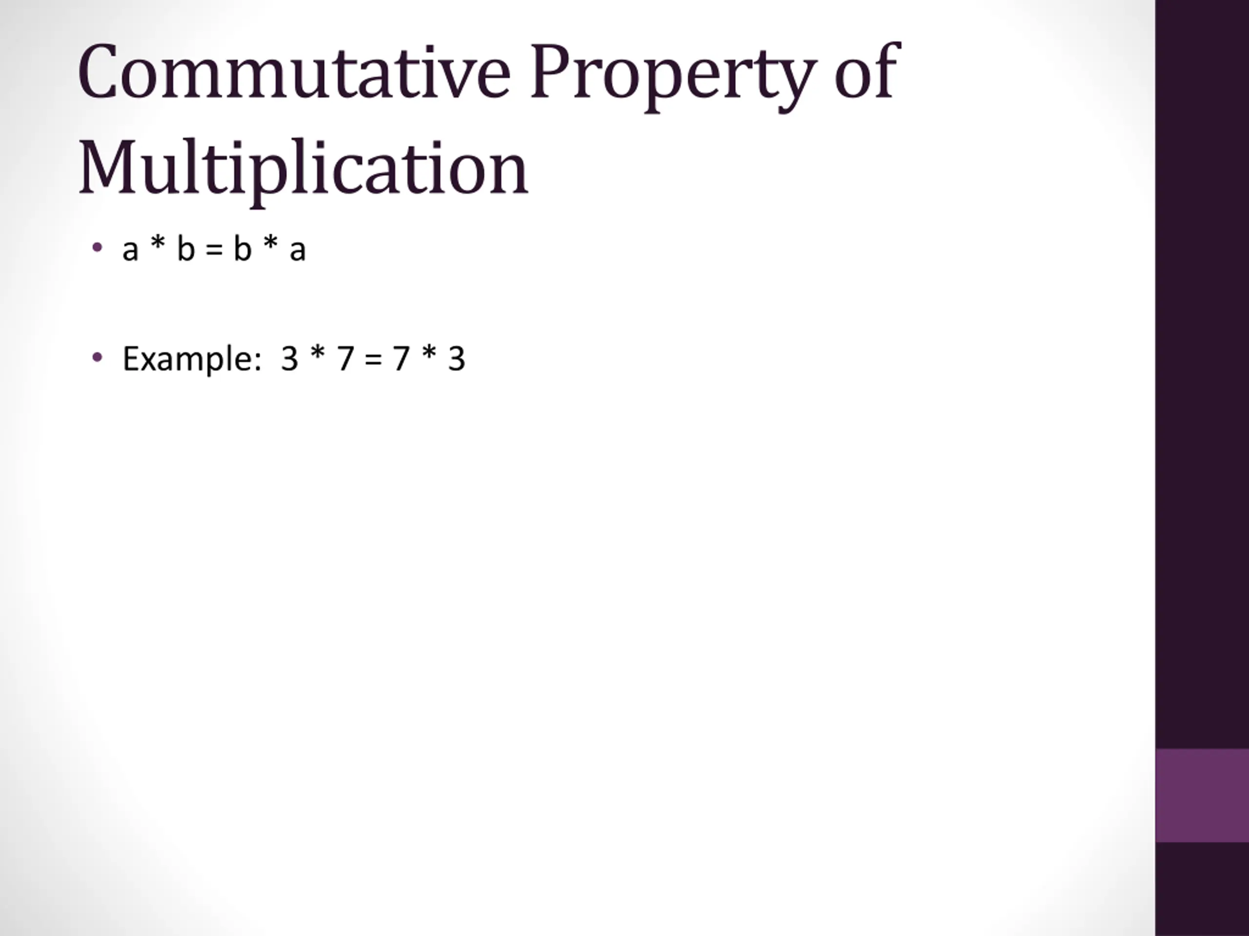 Commutative Property of Multiplication a * b = b * a Example: 3 * 7 = 7 * 3