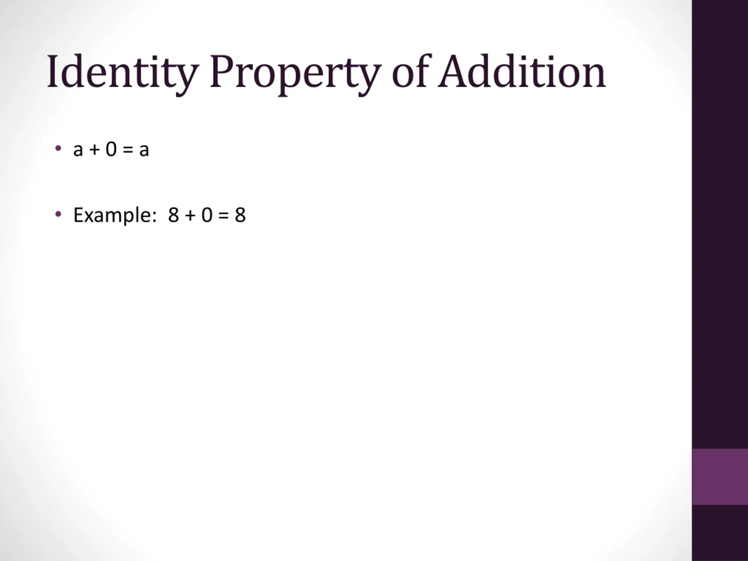 Identity Property of Addition a + 0 = a Example: 8 + 0 = 8