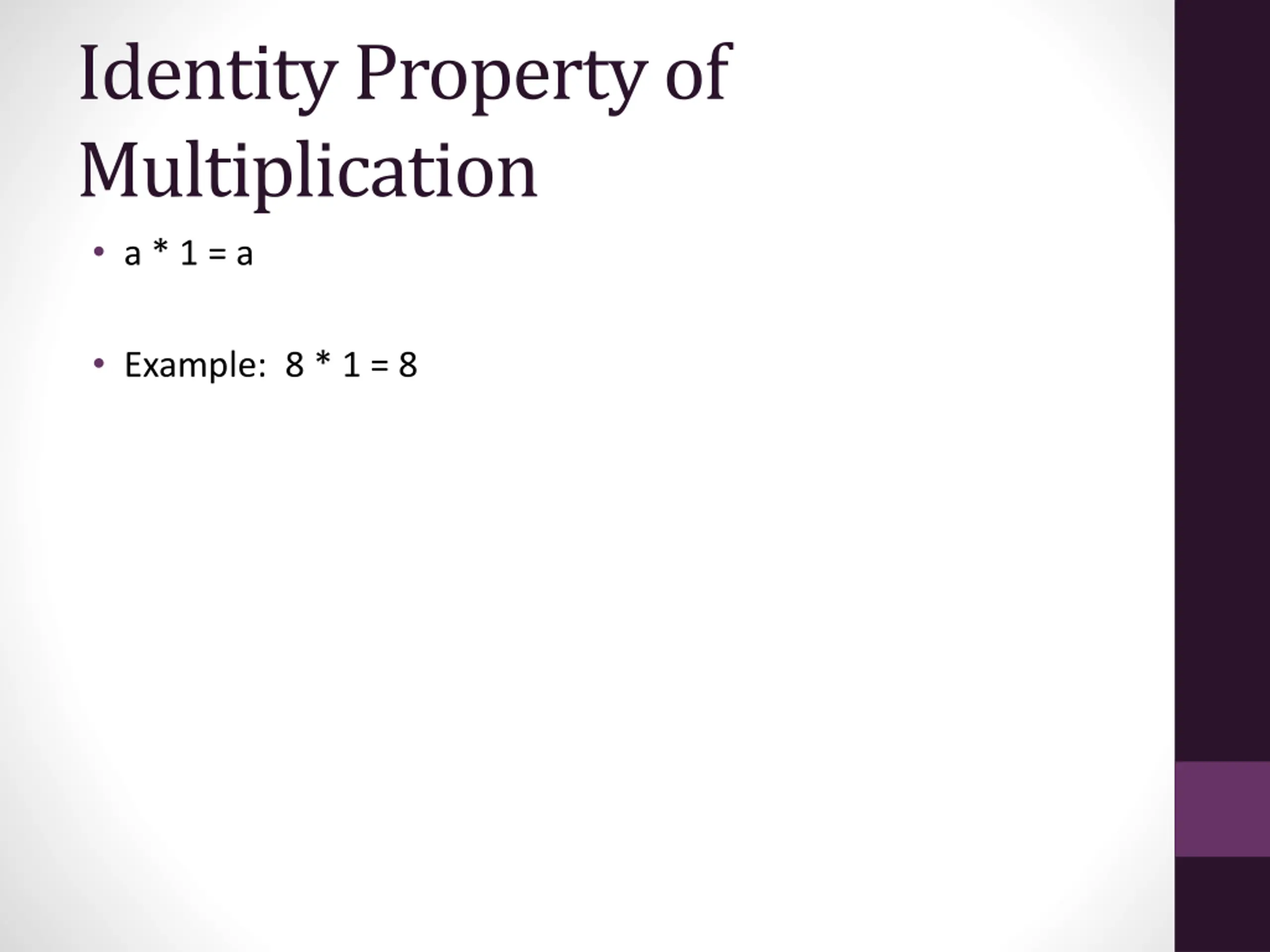 Identity Property of Multiplication a * 1 = a Example: 8 * 1 = 8