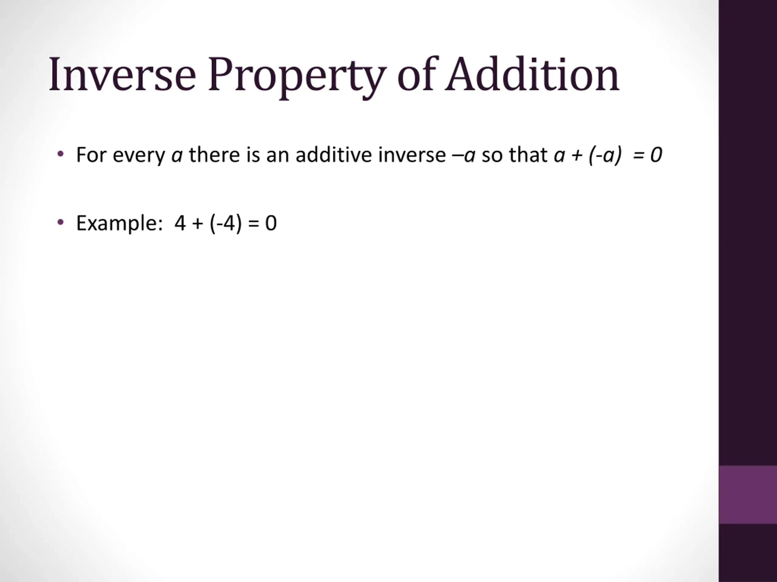 Inverse Property of Addition For every a there is an additive inverse a so that a + (-a) = 0 Example: 4 + (-4) = 0