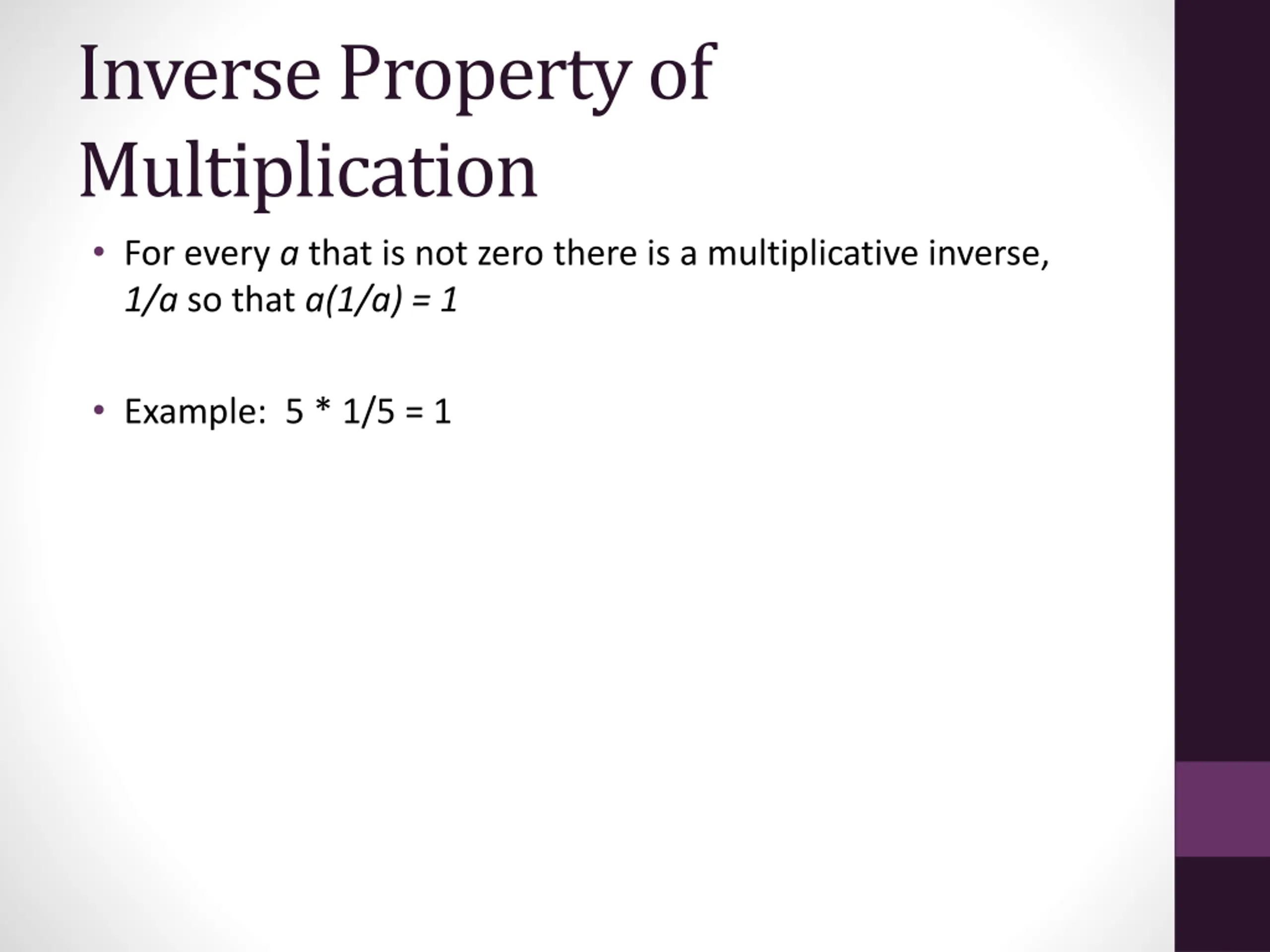 Inverse Property of Multiplication For every a that is not zero there is a multiplicative inverse, 1/a so that a(1/a) = 1 Example: 5 * 1/5 = 1