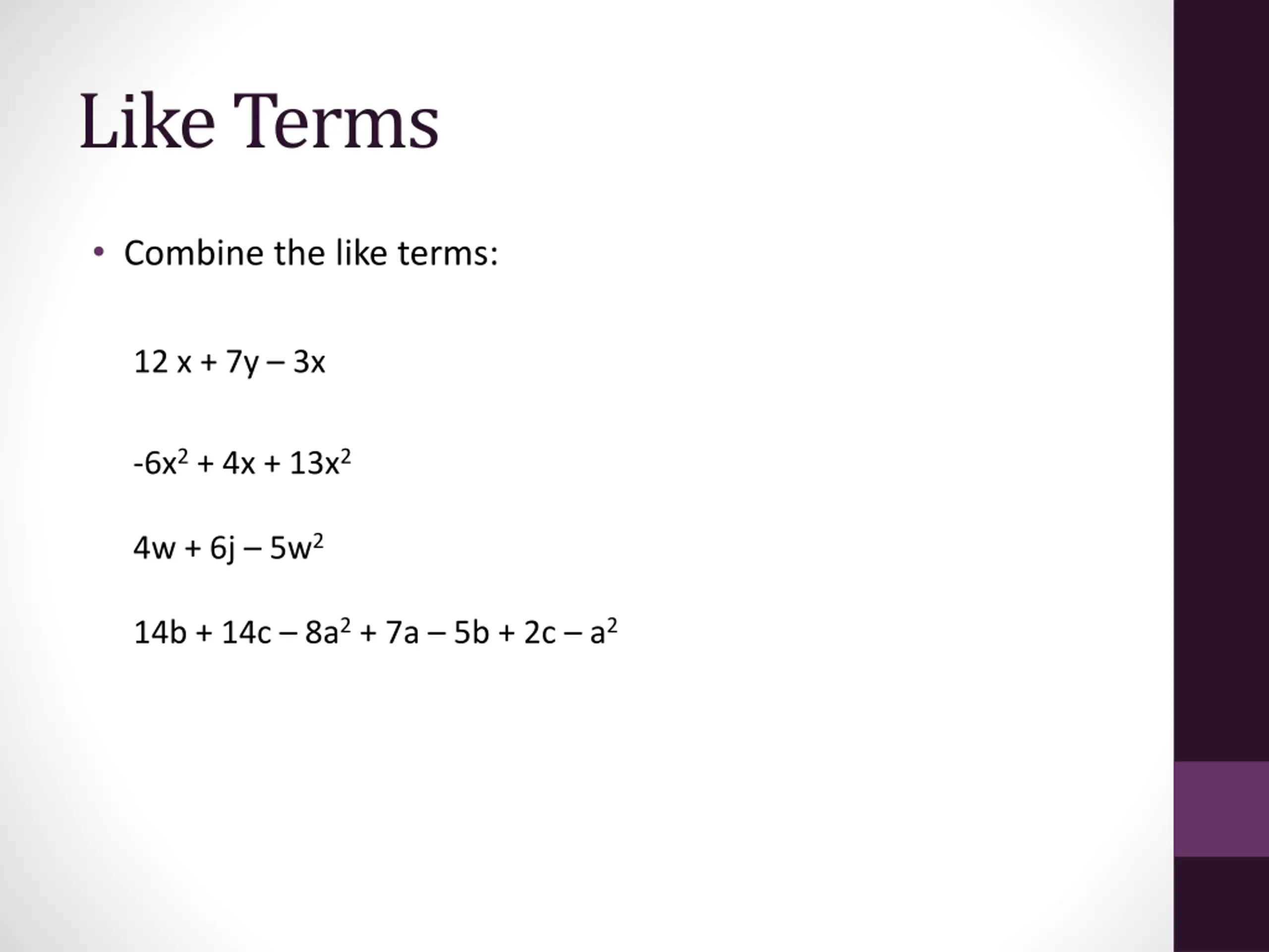 Like Terms Combine the like terms: 12 x + 7y 3x -6x2+ 4x + 13x2 4w + 6j 5w2 14b + 14c 8a2+ 7a 5b + 2c a2
