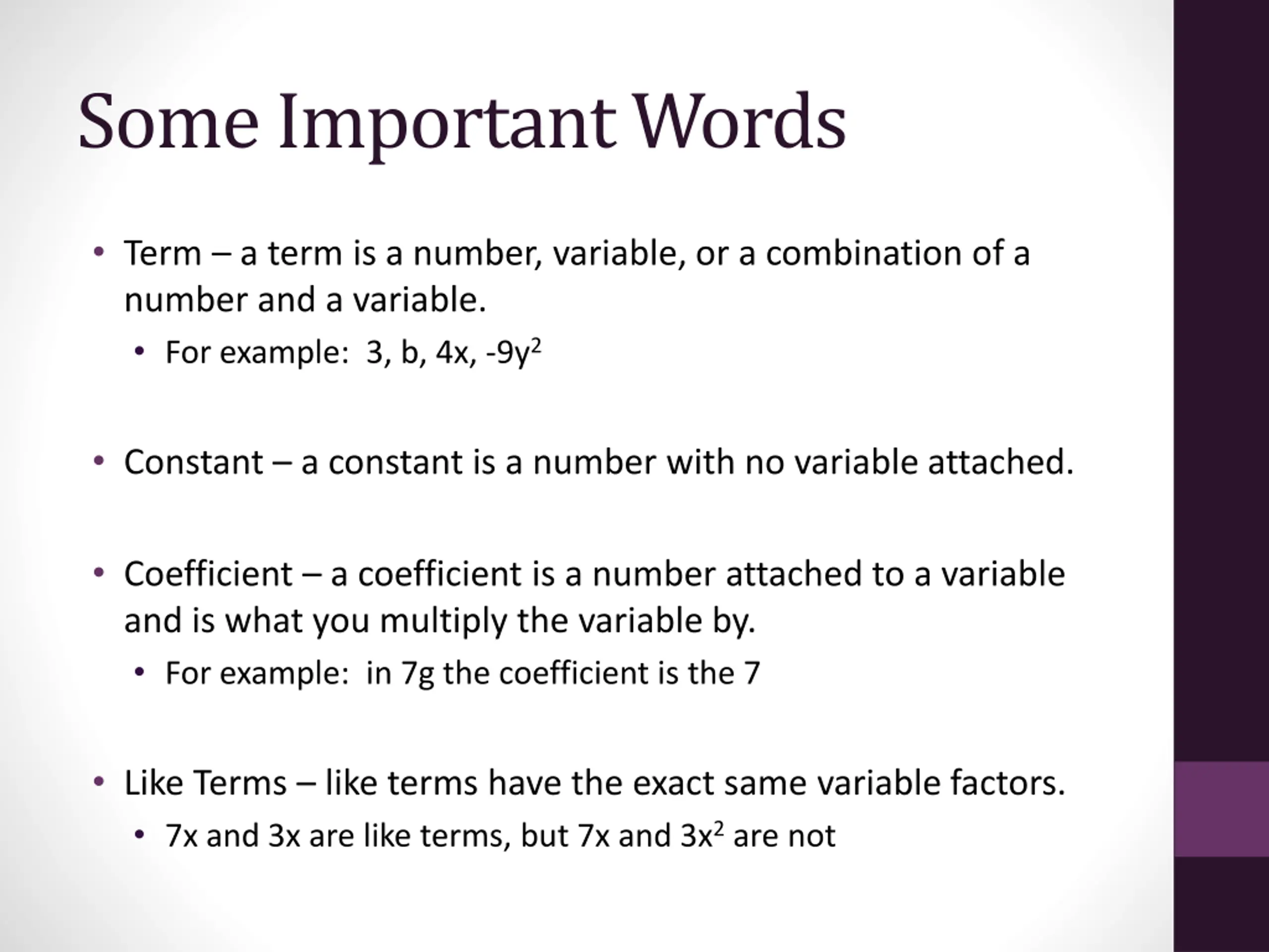 Some Important Words Term a term is a number, variable, or a combination of a number and a variable. For example: 3, b, 4x, -9y2 Constant a constant is a number with no variable attached. Coefficient a coefficient is a number attached to a variable and is what you multiply the variable by. For example: in 7g the coefficient is the 7 Like Terms like terms have the exact same variable factors. 7x and 3x are like terms, but 7x and 3x2are not