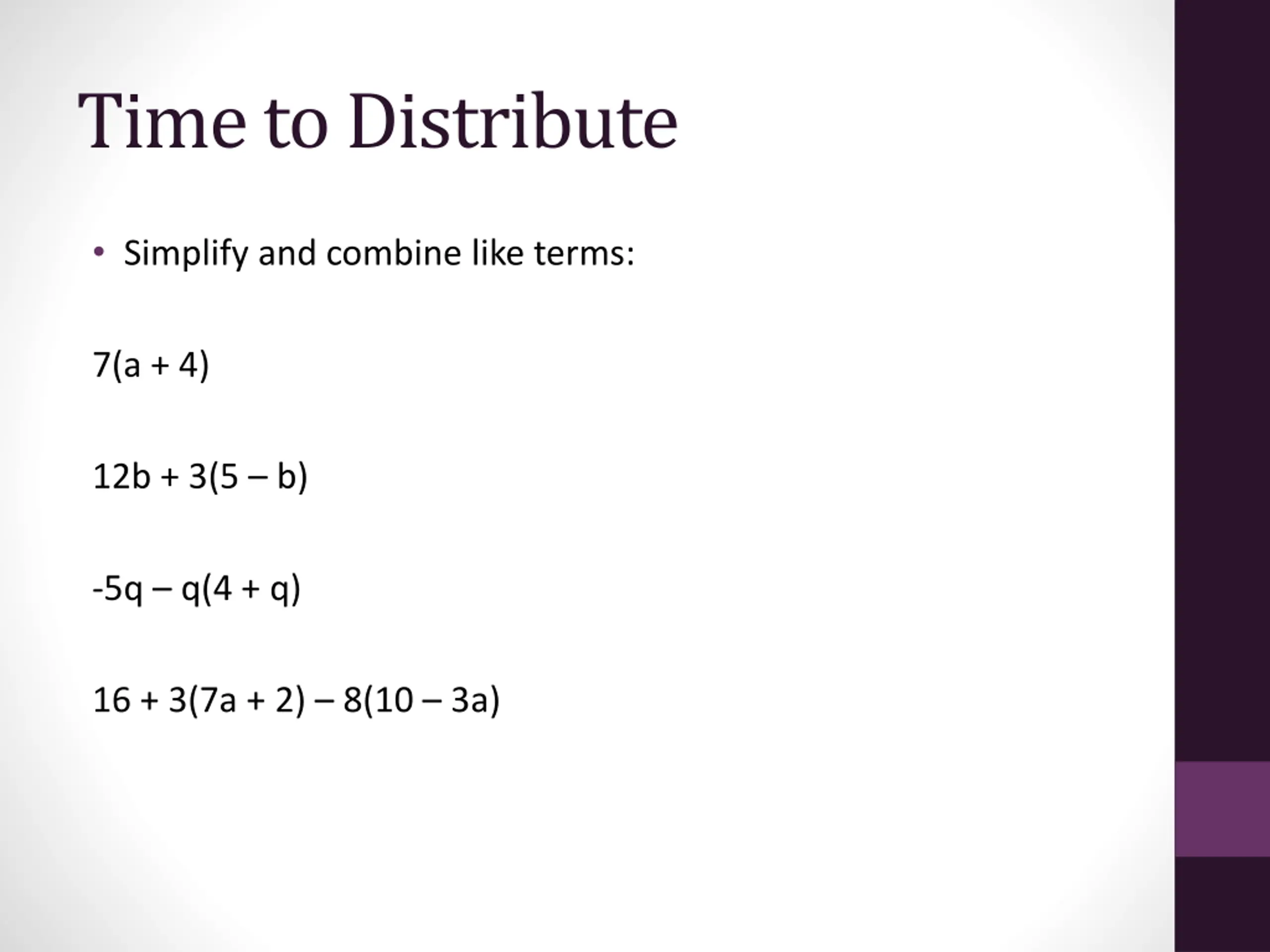 Time to Distribute Simplify and combine like terms: 7(a + 4) 12b + 3(5 b) -5q q(4 + q) 16 + 3(7a + 2) 8(10 3a)