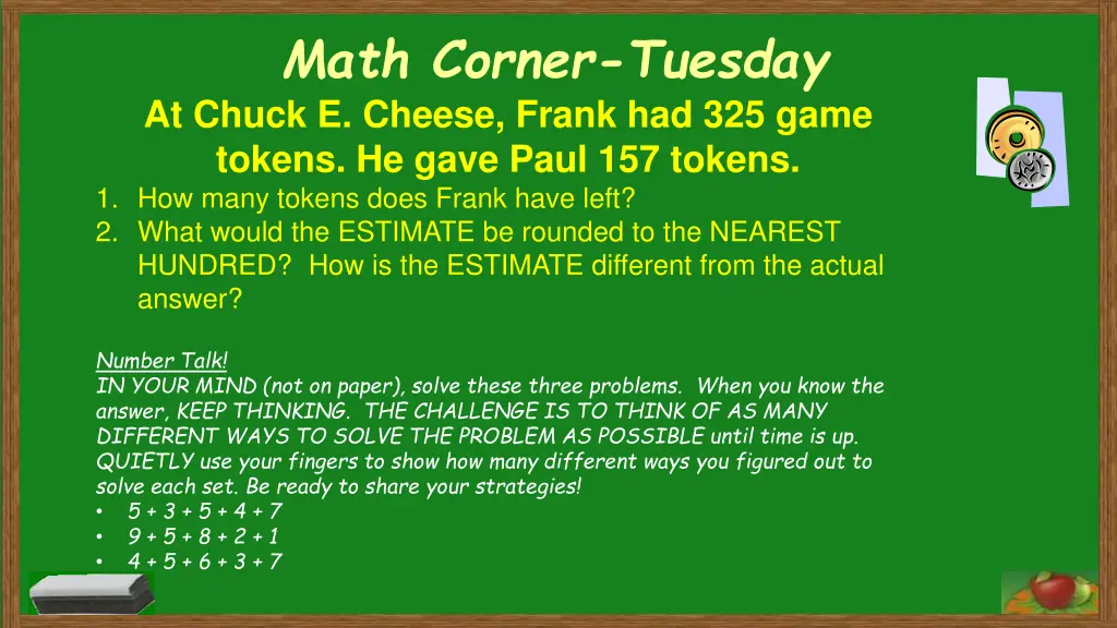 Math Corner-Tuesday At Chuck E. Cheese, Frank had 325 game tokens. He gave Paul 157 tokens. 1. How many tokens does Frank have left? 2. What would the ESTIMATE be rounded to the NEAREST HUNDRED? How is the ESTIMATE different from the actual answer? Number Talk! IN YOUR MIND (not on paper), solve these three problems. When you know the answer, KEEP THINKING. THE CHALLENGE IS TO THINK OF AS MANY DIFFERENT WAYS TO SOLVE THE PROBLEM AS POSSIBLE until time is up. QUIETLY use your fingers to show how many different ways you figured out to solve each set. Be ready to share your strategies! 5 + 3 + 5 + 4 + 7 9 + 5 + 8 + 2 + 1 4 + 5 + 6 + 3 + 7