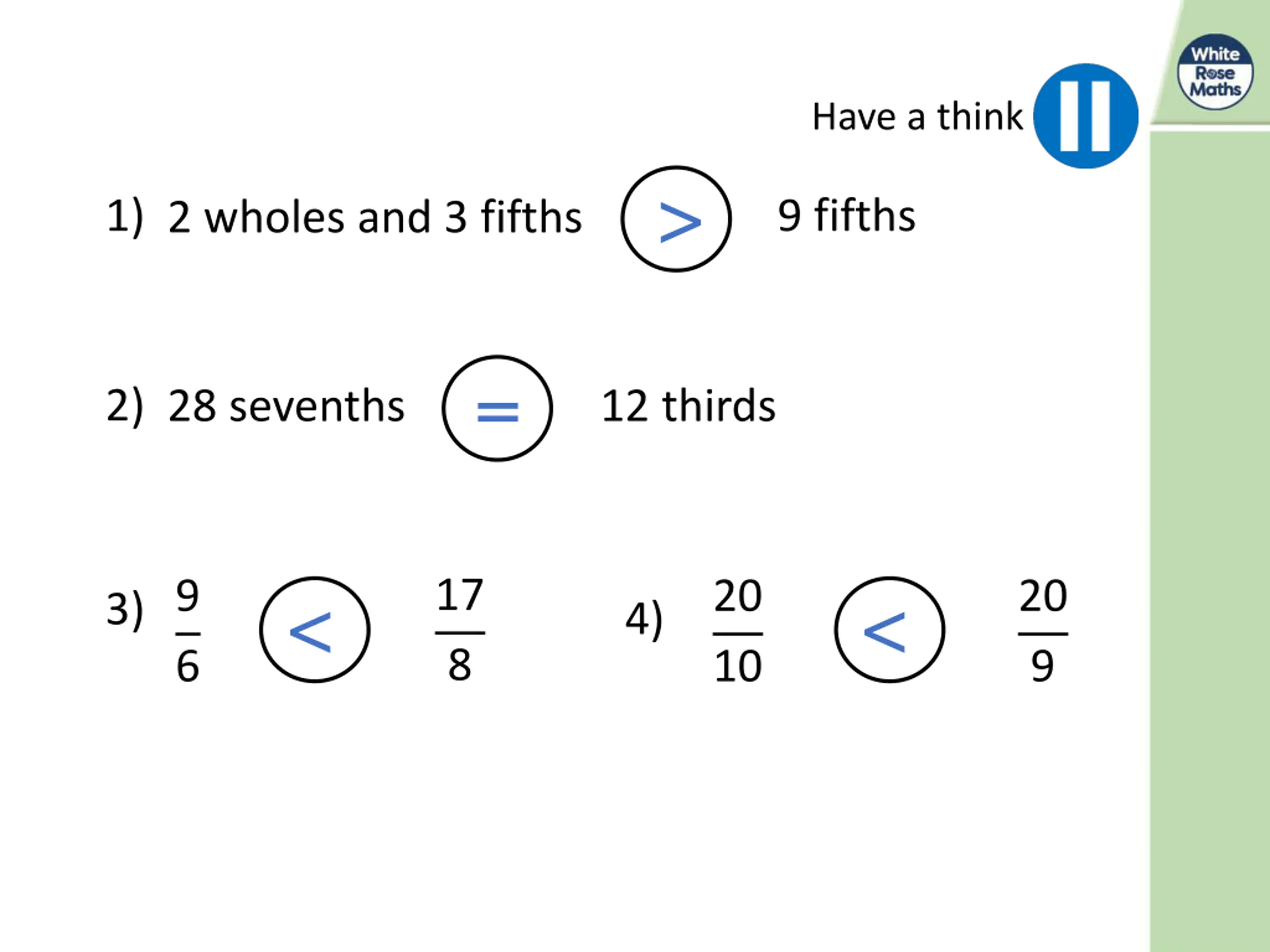 Have a think > > 1) 9 fifths 2 wholes and 3 fifths = = 2) 28 sevenths 12 thirds 17 8 3) 9 4) 20 20 9 < < < < 6 10