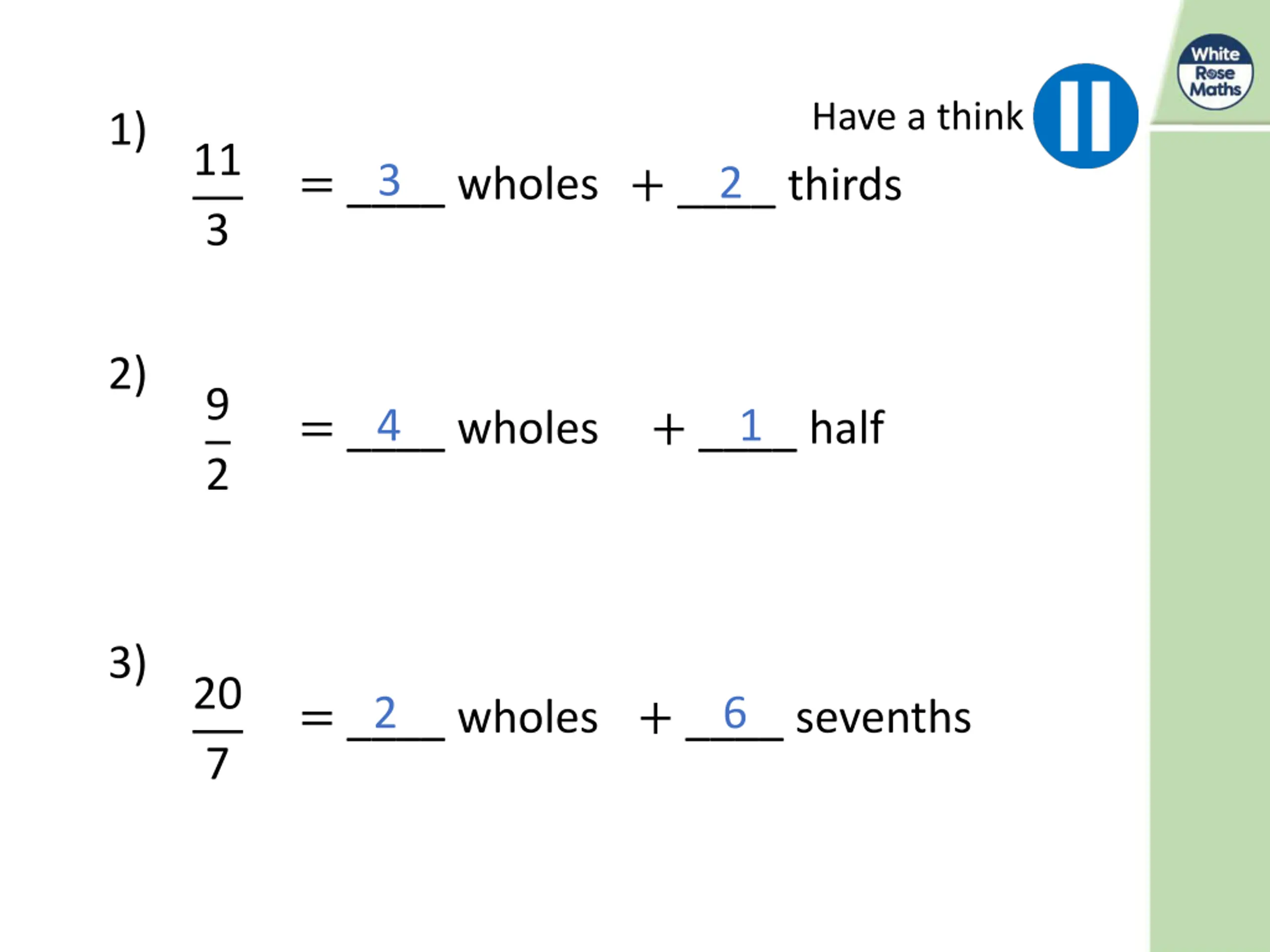Have a think 1) 11 3 = ____ wholes 3 + ____ thirds 2 2) 9 2 = ____ wholes 4 + ____ half 1 3) 20 7 = ____ wholes 2 + ____ sevenths 6