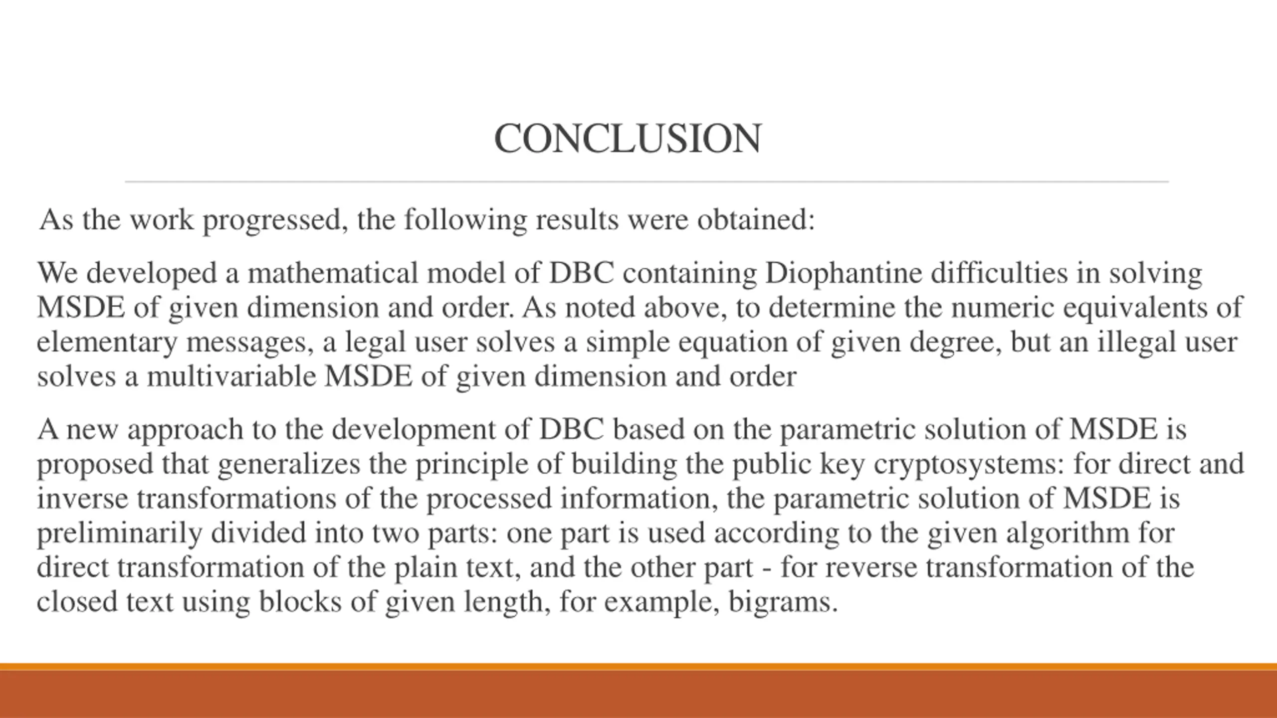CONCLUSION As the work progressed, the following results were obtained: We developed a mathematical model of DBC containing Diophantine difficulties in solving MSDE of given dimension and order. As noted above, to determine the numeric equivalents of elementary messages, a legal user solves a simple equation of given degree, but an illegal user solves a multivariable MSDE of given dimension and order A new approach to the development of DBC based on the parametric solution of MSDE is proposed that generalizes the principle of building the public key cryptosystems: for direct and inverse transformations of the processed information, the parametric solution of MSDE is preliminarily divided into two parts: one part is used according to the given algorithm for direct transformation of the plain text, and the other part - for reverse transformation of the closed text using blocks of given length, for example, bigrams.