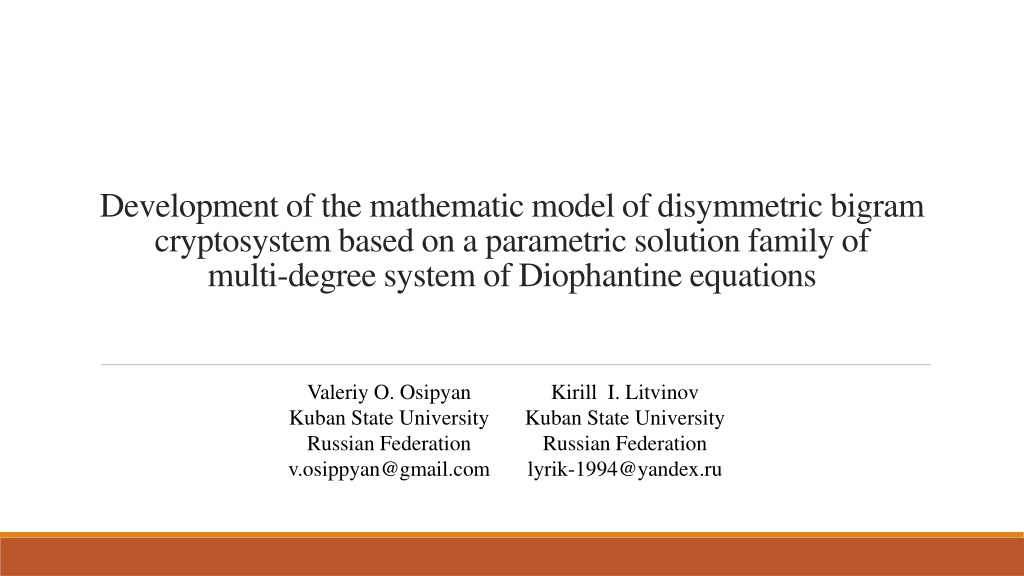Explore the development of a mathematical model for a disymmetric bigram cryptosystem using parametric solutions of multi-degree Diophantine equations. Learn about the Diophantine equation system, solutions properties, and parameterization method for multi-degree systems. Dive into the proposed cryptosystem based on Diophantine equations and an alphabet DBC model with 2-parameter solutions.