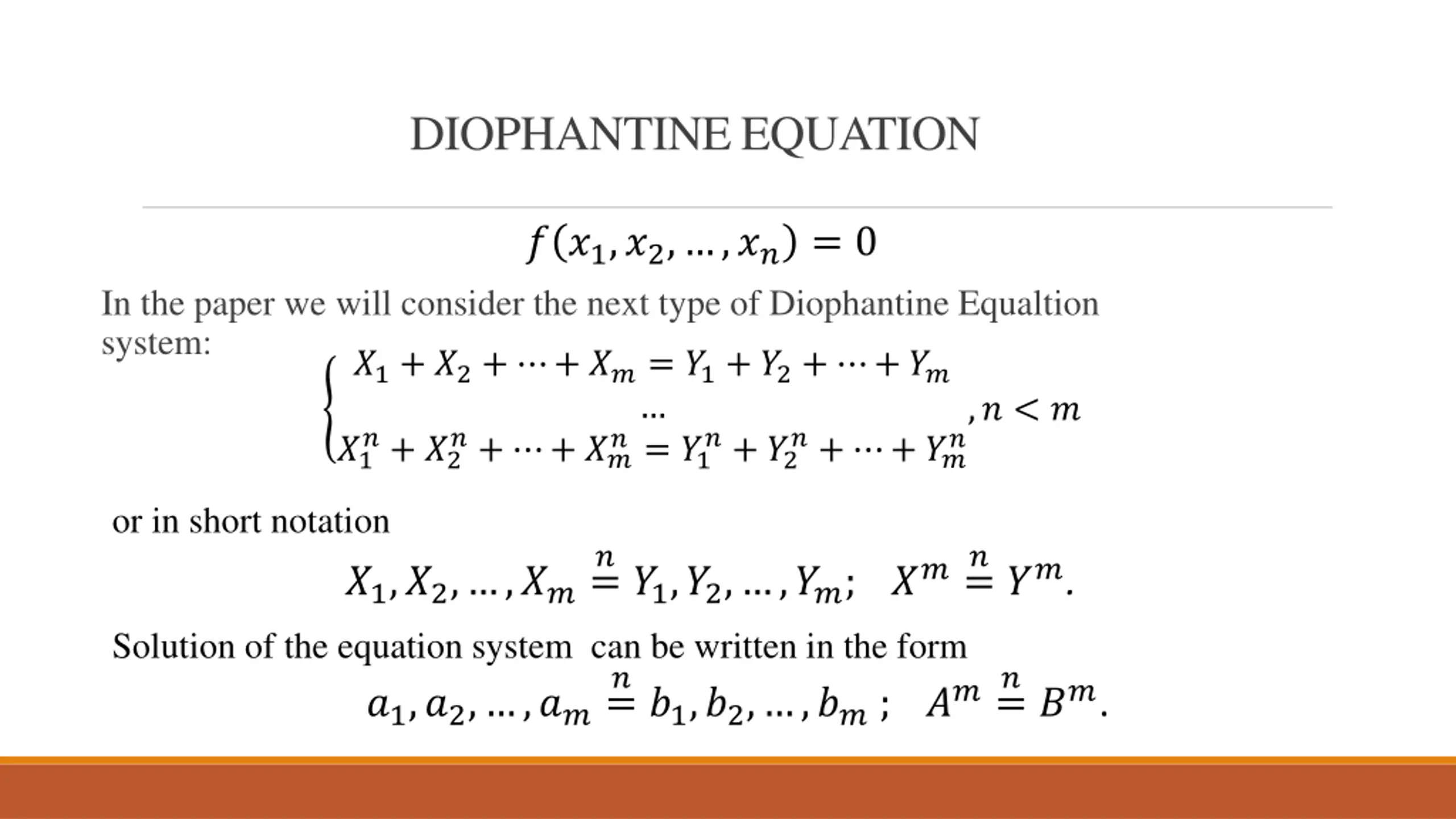 DIOPHANTINEEQUATION ? ?1,?2, ,?? = 0 In the paper we will consider the next type of Diophantine Equaltion system: ?1+ ?2+ + ??= ?1+ ?2+ + ?? ?,? < ? ?+ ?2 ?+ + ?? ?= ?1?+ ?2?+ + ?? ?1 or in short notation ??1,?2, ,??; ??= ???. ?1,?2, ,??= Solution of the equation system can be written in the form ??1,?2, ,??; ??= ???. ?1,?2, ,??=