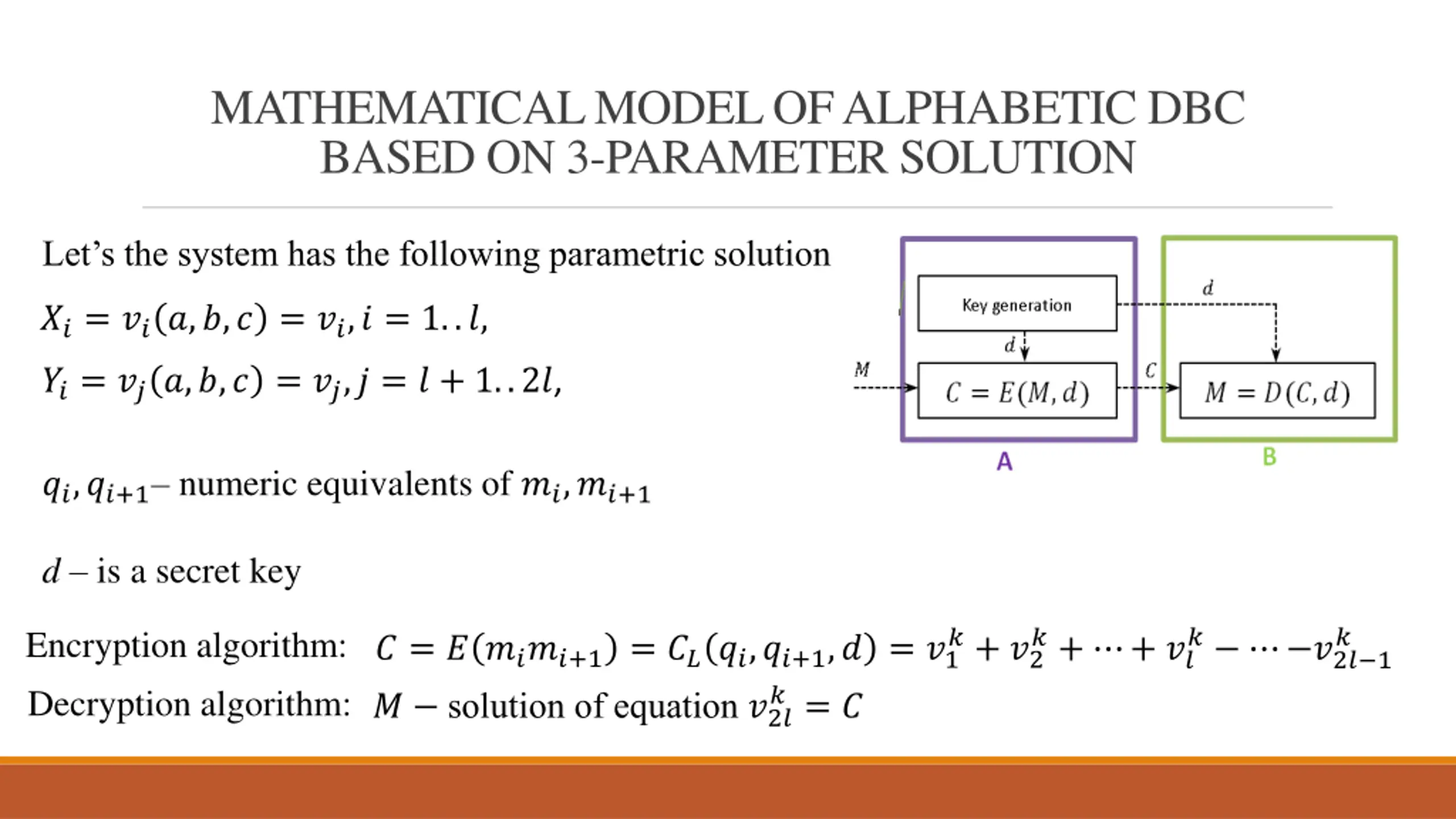 MATHEMATICAL MODEL OF ALPHABETIC DBC BASED ON 3-PARAMETER SOLUTION Let s the system has the following parametric solution ??= ???,?,? = ??,? = 1..?, ??= ???,?,? = ??,? = ? + 1..2?, ??,??+1 numeric equivalents of ??,??+1 d is a secret key Encryption algorithm: Decryption algorithm: ? ?2? 1 ? ?+ ?2 ?+ + ?? ? = ? ????+1 = ????,??+1,? = ?1 ? solution of equation ?2? ?= ?